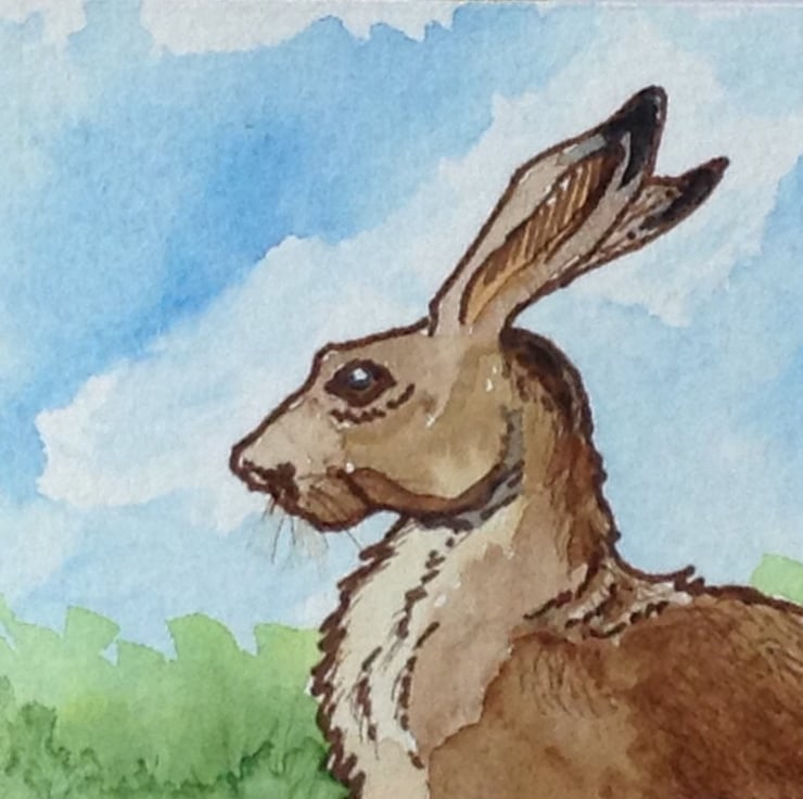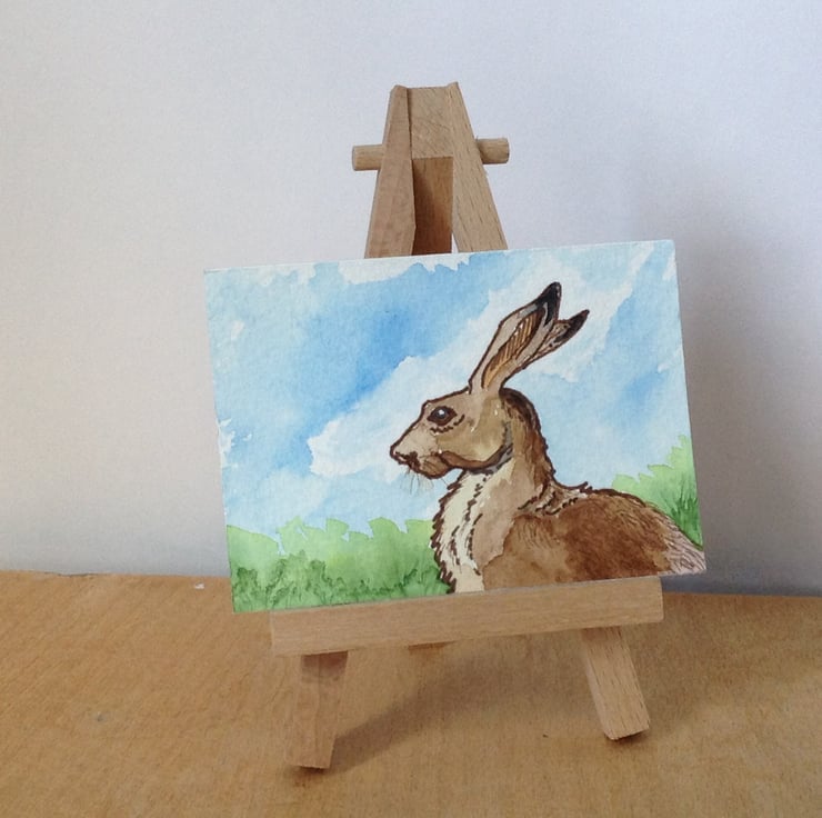Aceo collectable artwork of a hare and landscape background painted using watercolour paints and paper with permanent ink. Supplied with a small envelope and sent in a larger envelope for posted, which is free to UK destinations.