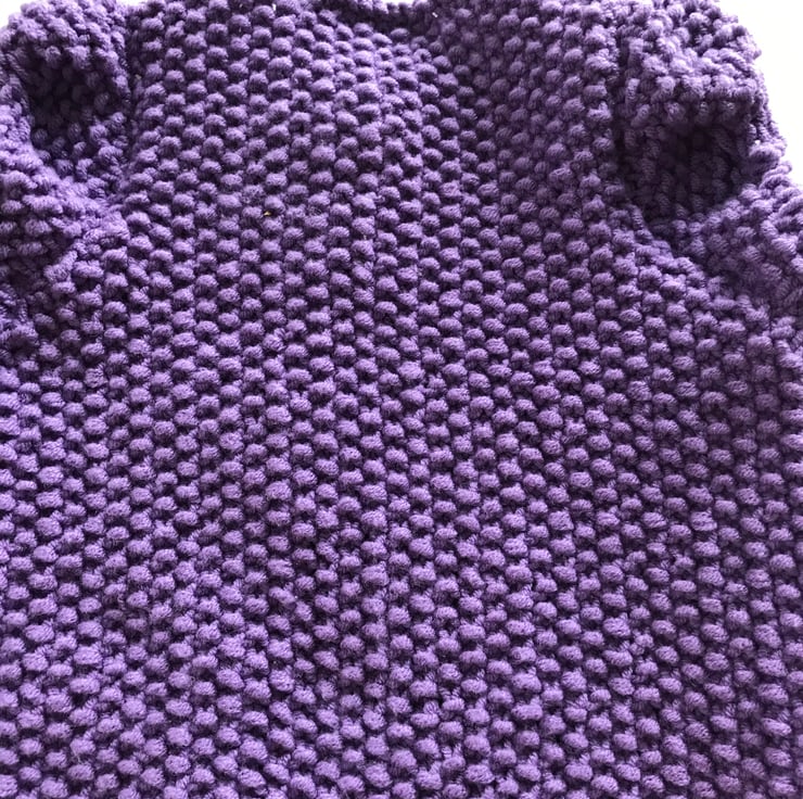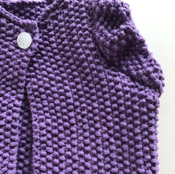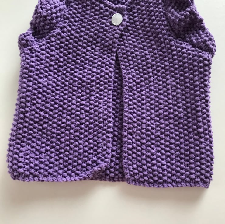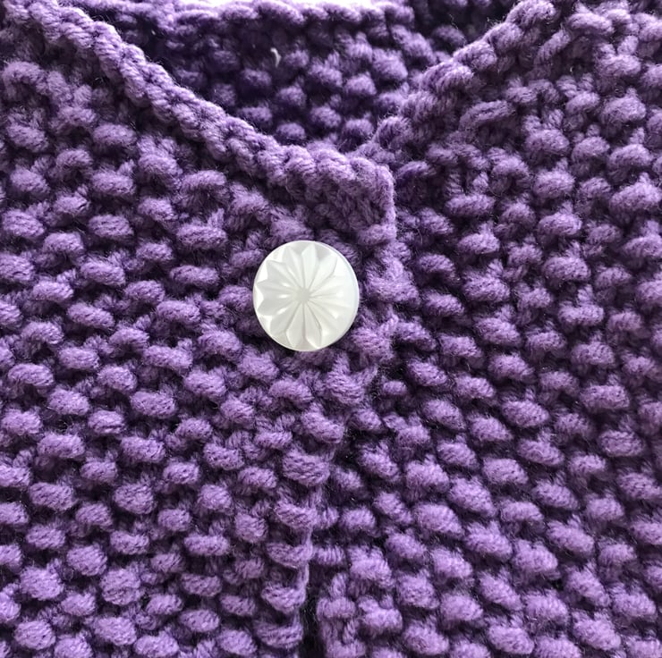This moss stitch cardigan is hand knitted in a cotton and acrylic yarn. It has very short ruffle sleeves and would make an attractive extra layer summer or winter. It fastens with a button at the neck.