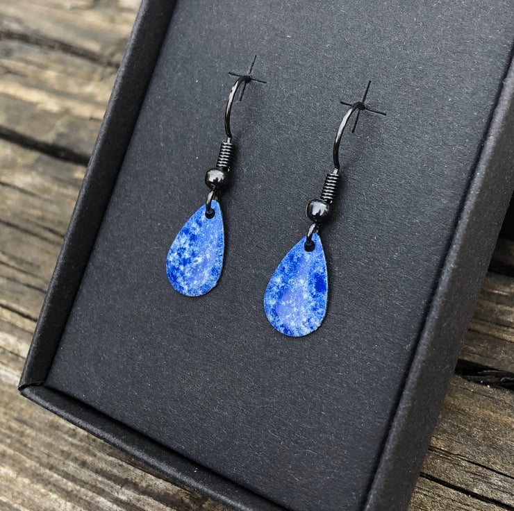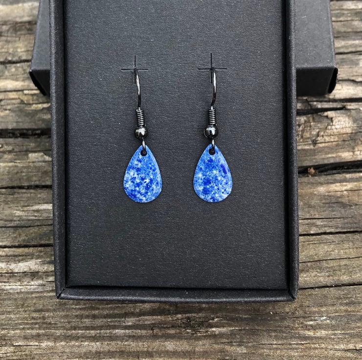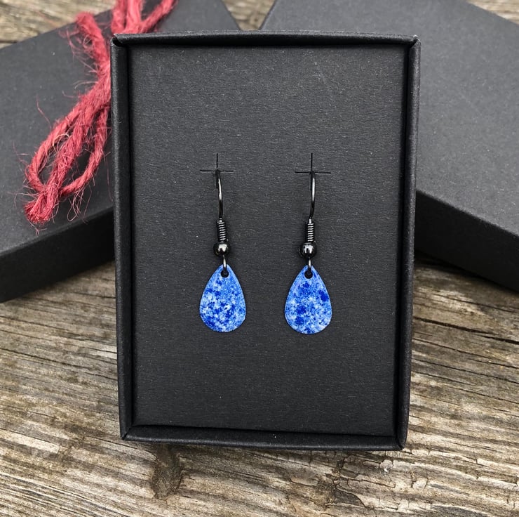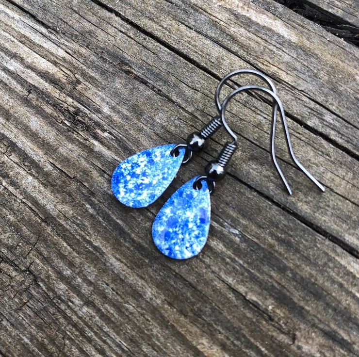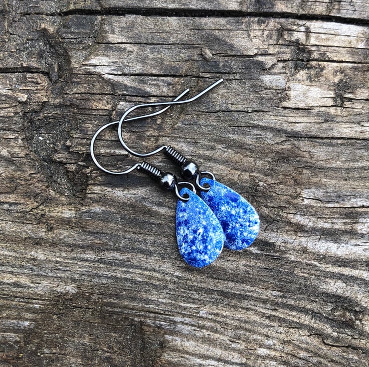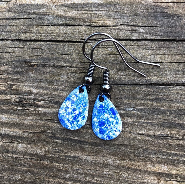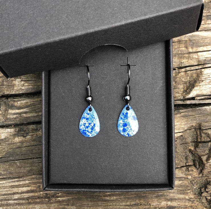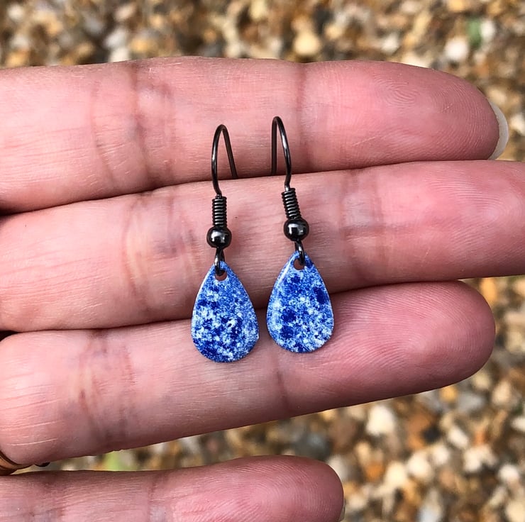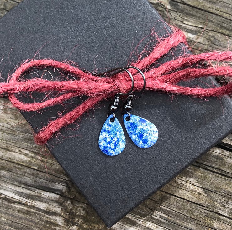 13x8mm silver tone metal charms have been hand enamel in a selection of cold enamel colours. The charms hang from antique black brass earrings, but can be upgrade for an additional cost of £2.50 to Sterling Silver.