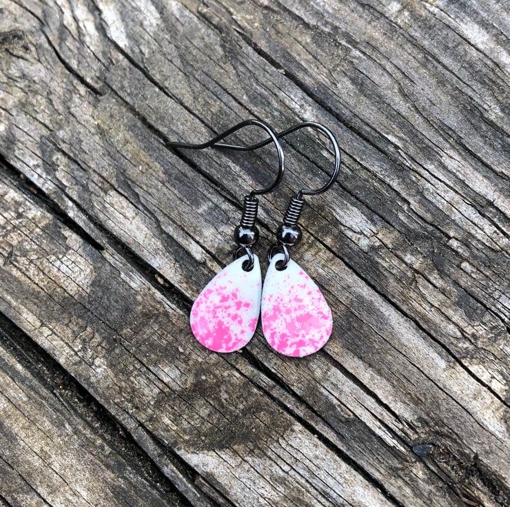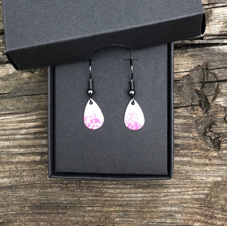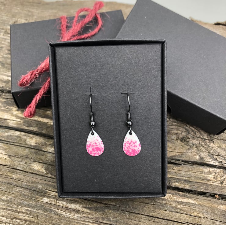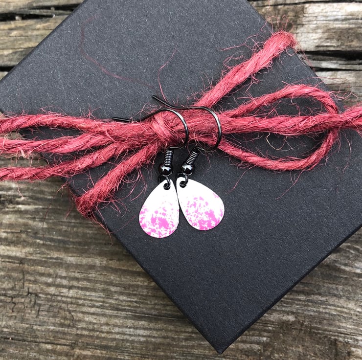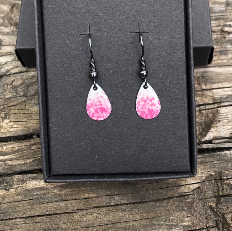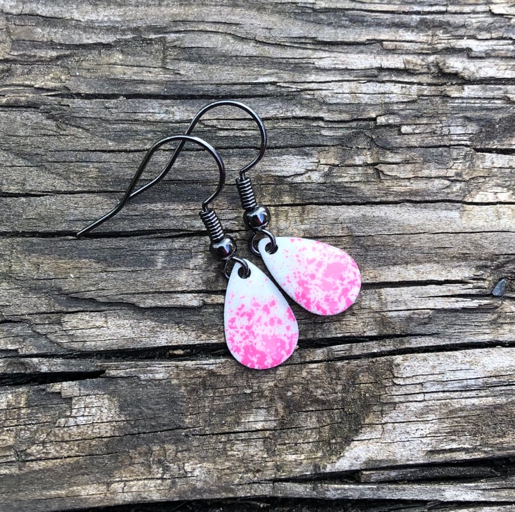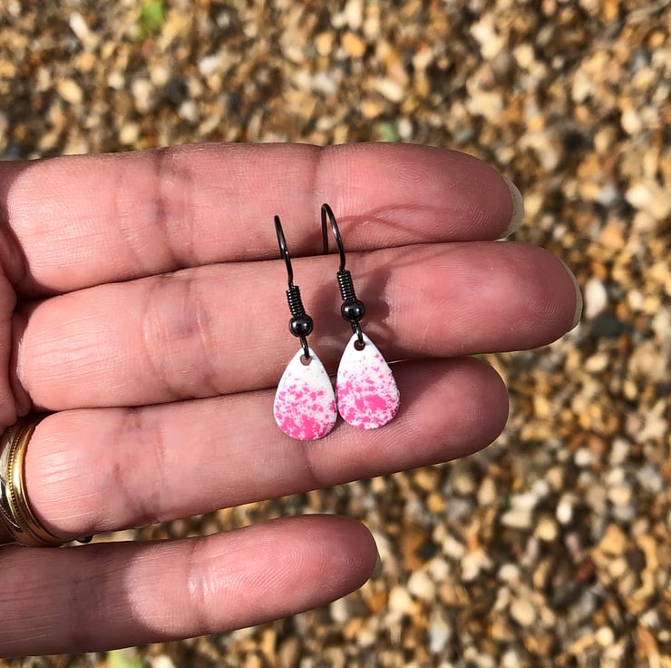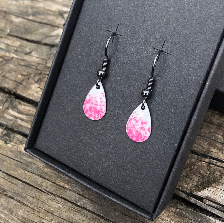 13x8mm silver tone metal charms have been hand enamel in a selection of cold enamel colours. The charms hang from antique black brass earrings, but can be upgrade for an additional cost of £2.50 to Sterling Silver.