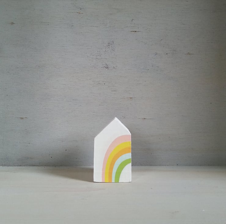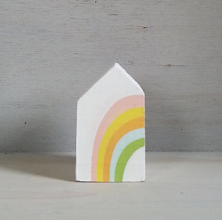 This one of a kind little wooden house is made from reclaimed wood and is painted in white and decorated with a rainbow transfer.