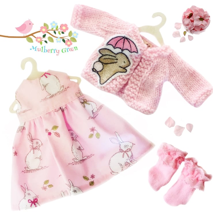 A gorgeous pale pink cardigan, embroidered with a cute little bunny, to fit the Mulberry Green characters. The cardigan is hand knitted and comes on a cute little wooden hanger. It matches the pink bunny dress.