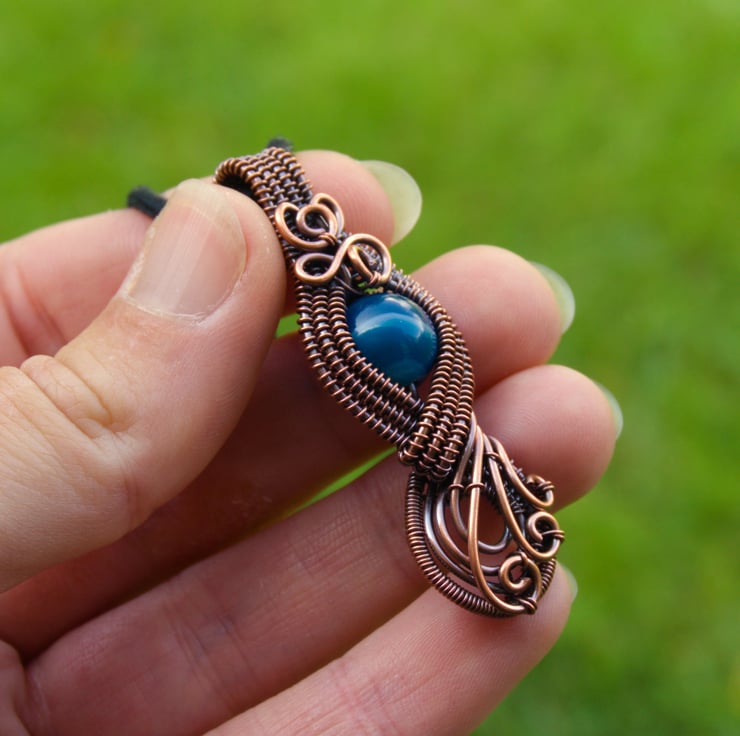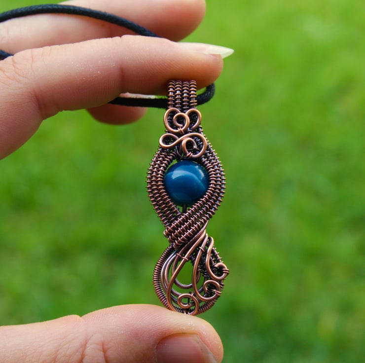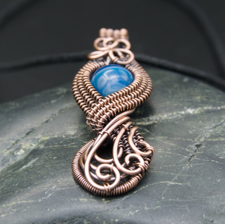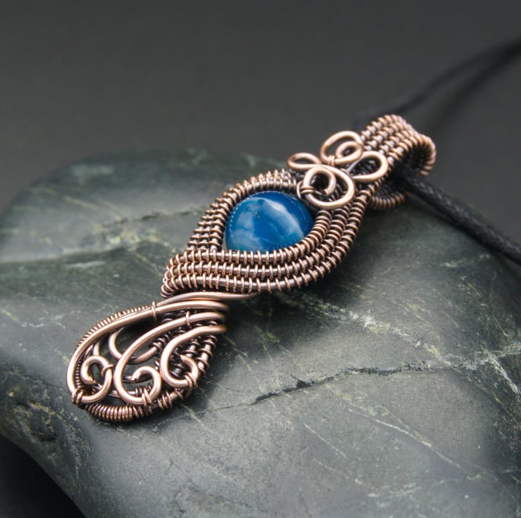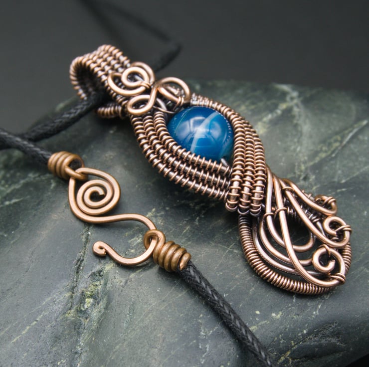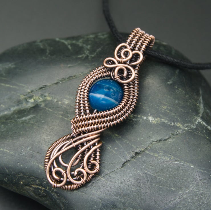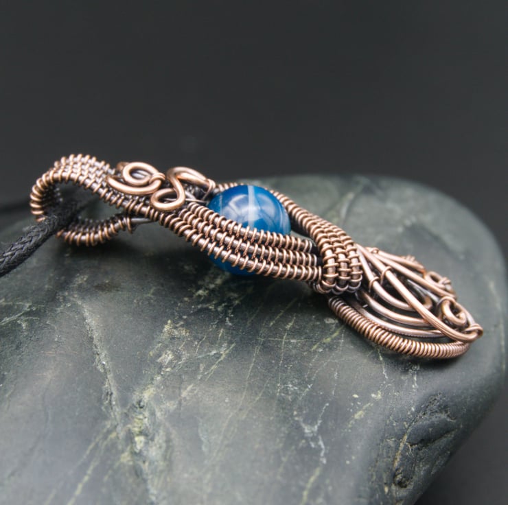 This beautiful & distinctive pendant has been hand woven from lengths of copper wire & features a 10mm round striped blue Agate bead. I've used a figure-of-8 weave to create a bail, which then splits to wrap either side of the bead. Below the bead I've looped the wires around to mirror the curves above, finishing with spiralled details across the bottom loops & above the bead.