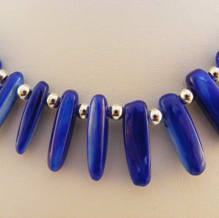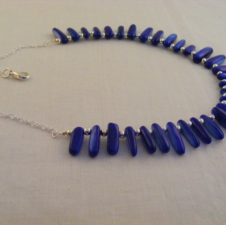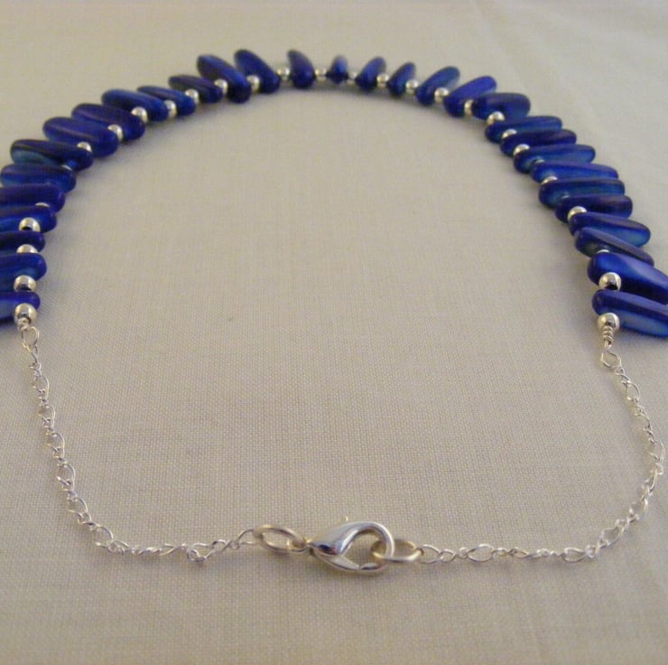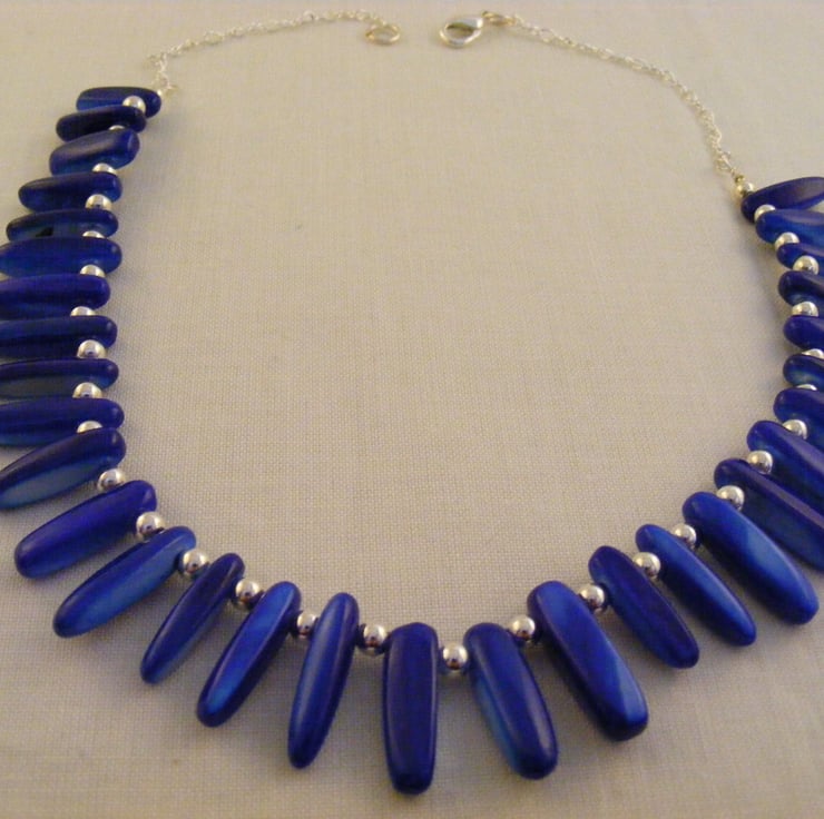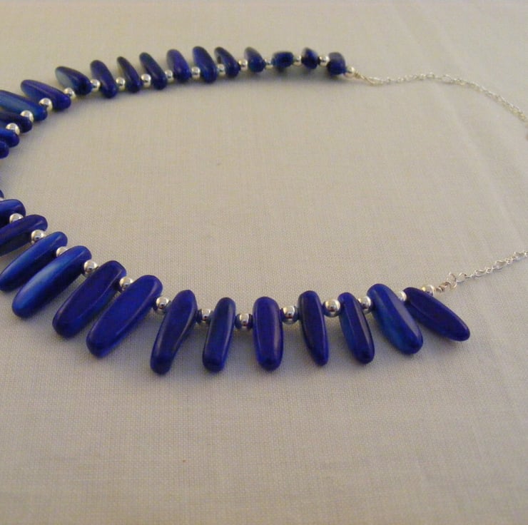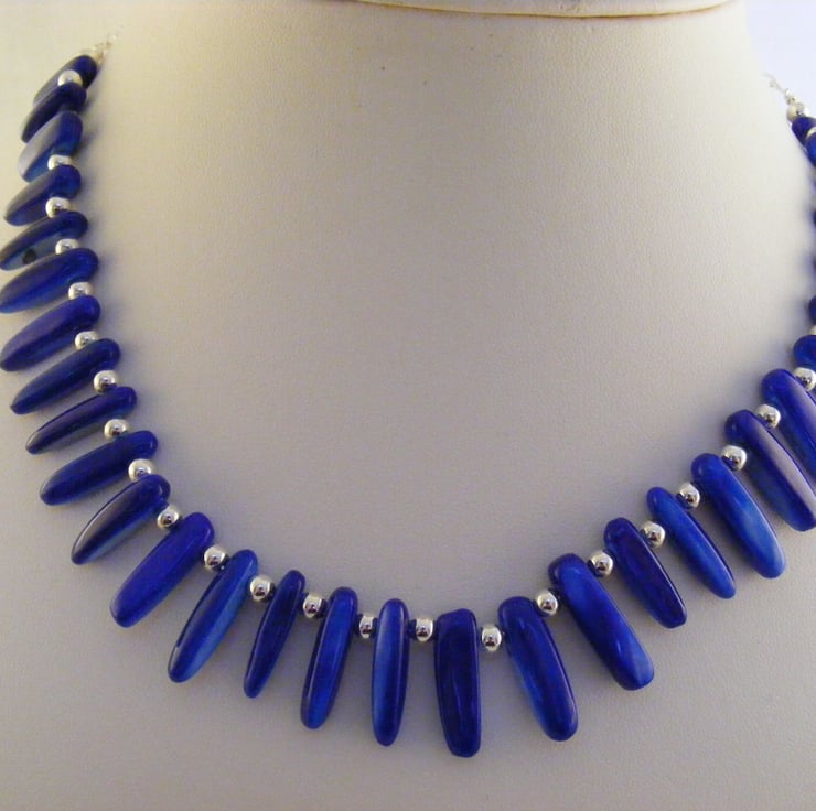 I have handmade this one of a king necklace using graduated royal blue shell slices and