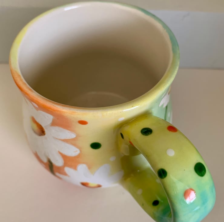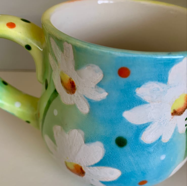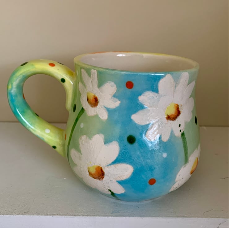 This daisy mug it’s the perfect size for your favourite hot drinks. Hand painted by myself with the brightest and best glazes on earthenware clay each will be slightly different and unique. I use a mixture of glaze and resist which when fired, not only looks lovely is also full of texture. The daisy design wraps around the mug in different sunny colours evoking a real sense of summer.