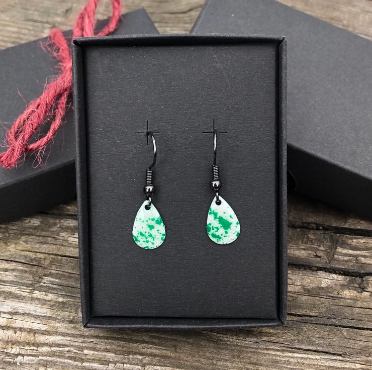 ‘Green Fairy Dust’ Enamel Teardrop Earrings. Sterling silver upgrade available.