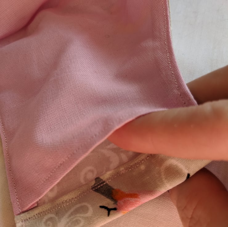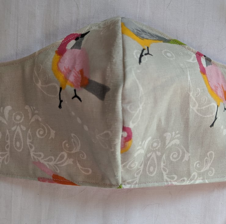 This is a 100% cotton face mask with elastic ties. It provides full coverage of the nose and mouth with a lightweight breathable fabric. The elastic used is fold-over elastic of the type used in lingerie, which is softer and more comfortable than ordinary elastic. The ties of the elastic are adjustable for a better fit. The lining is open, to allow insertion of a filter if desired (see photos).