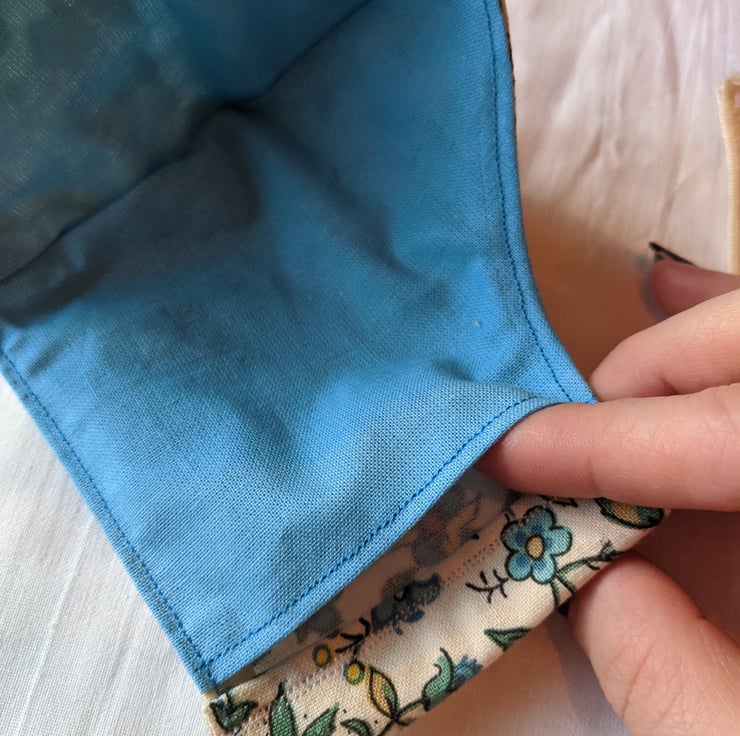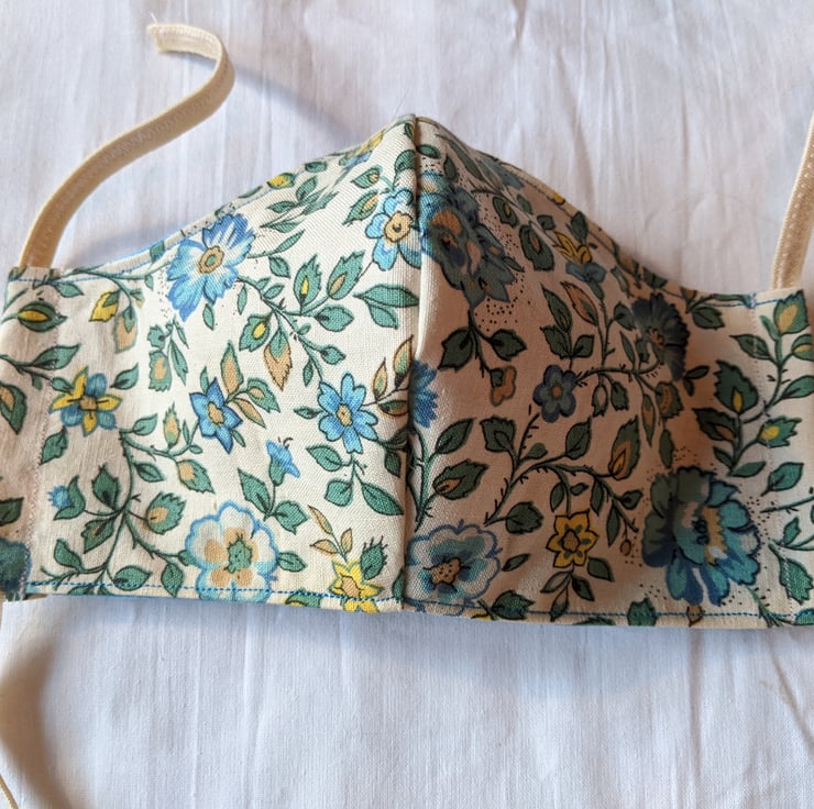 This is a 100% cotton face mask with elastic ties, made of the "Dimity" Sanderson material of light upholstery weight. It provides full coverage of the nose and mouth with a breathable fabric. The elastic used is fold-over elastic of the type used in lingerie, which is softer and more comfortable than ordinary elastic. The ties of the elastic are adjustable for a better fit. The lining is open, to allow insertion of a filter if desired (see photos).