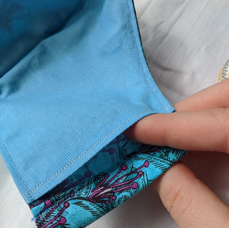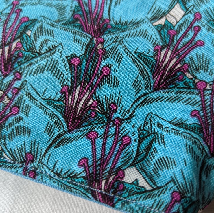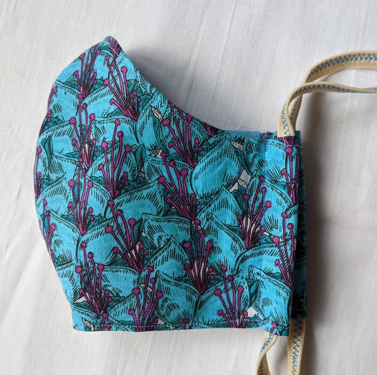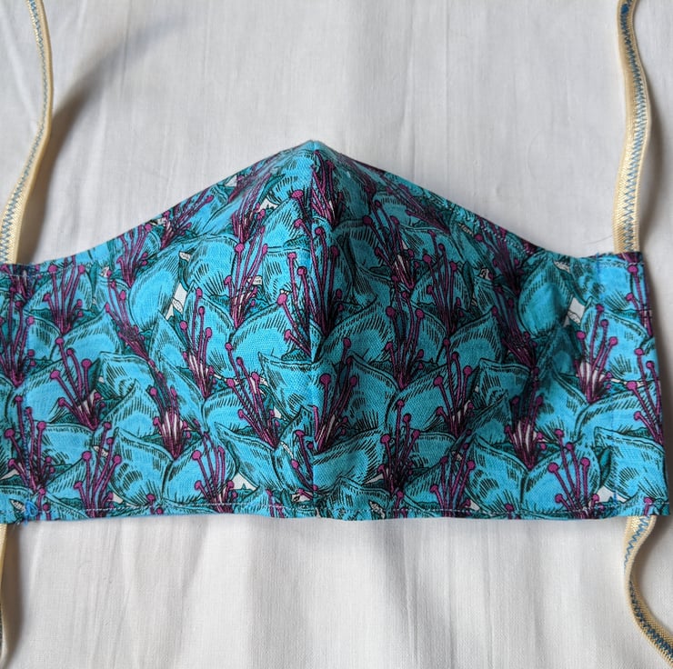 This is a 100% cotton face mask with elastic ties. It provides full coverage of the nose and mouth with a lightweight breathable fabric. The elastic used is fold-over elastic of the type used in lingerie, which is softer and more comfortable than ordinary elastic. The ties of the elastic are adjustable for a better fit. The lining is open, to allow insertion of a filter if desired (see photos).