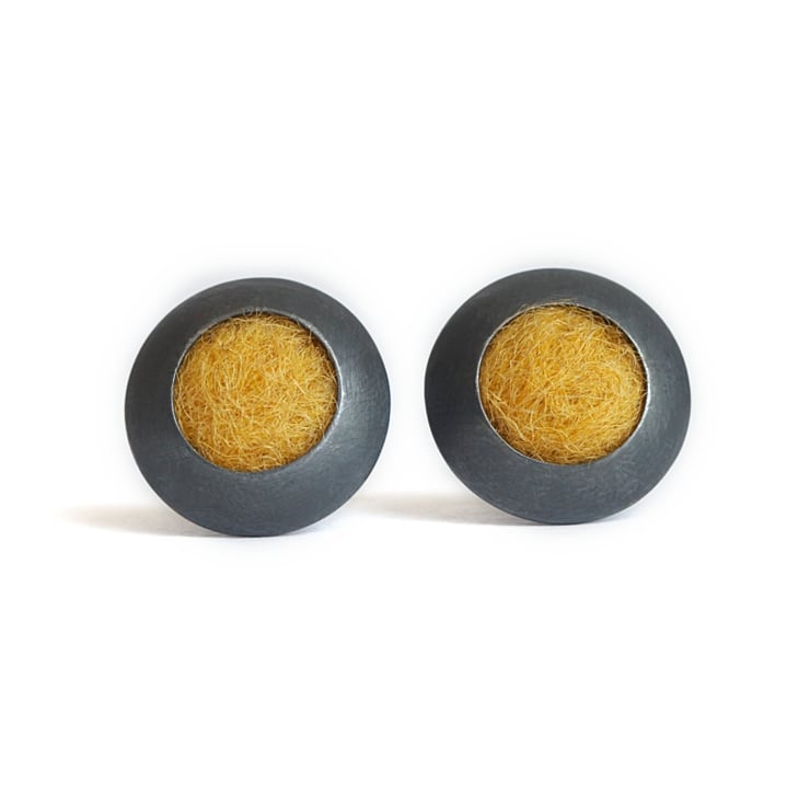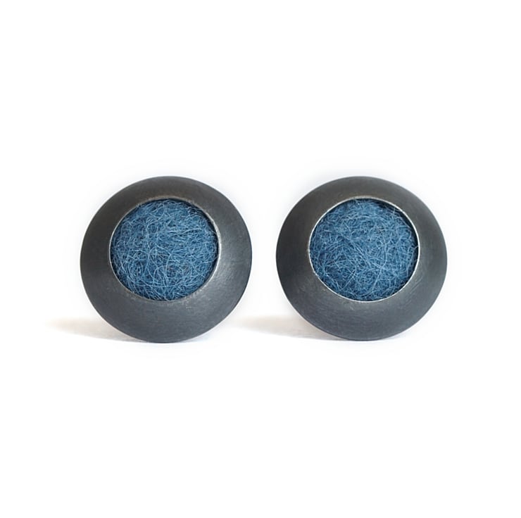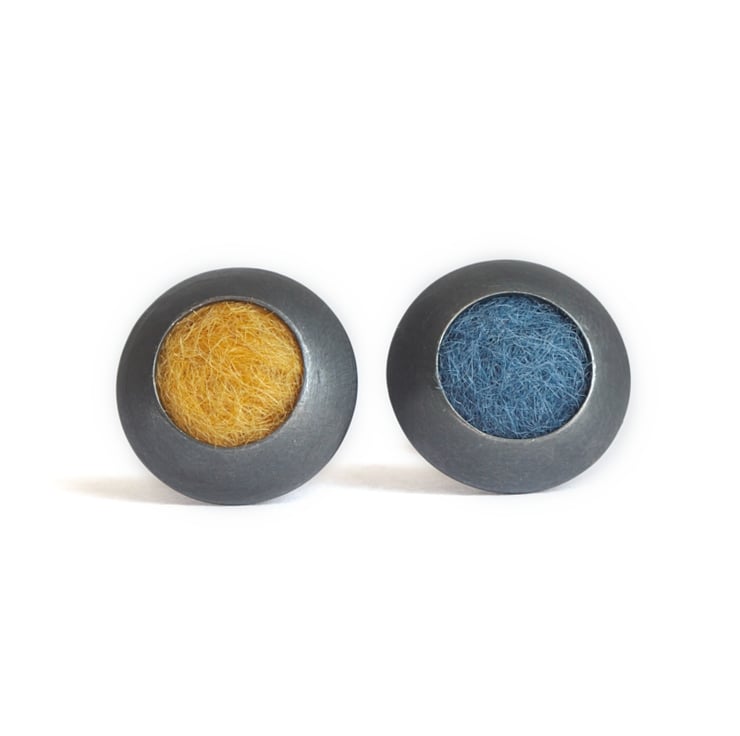 Simple original earrings handmade from oxidised sterling silver and colourful felt. Deep black colour of silver gives great contrast with bright blue and yellow felt. Very simple form of these earrings makes them perfect for everyday wear. Will be ideal for the office or a party.