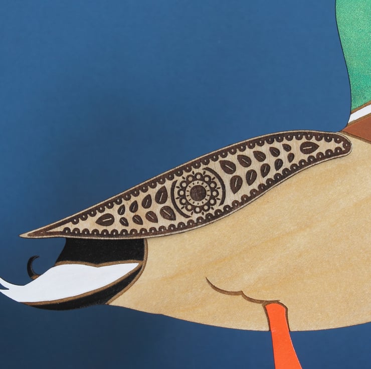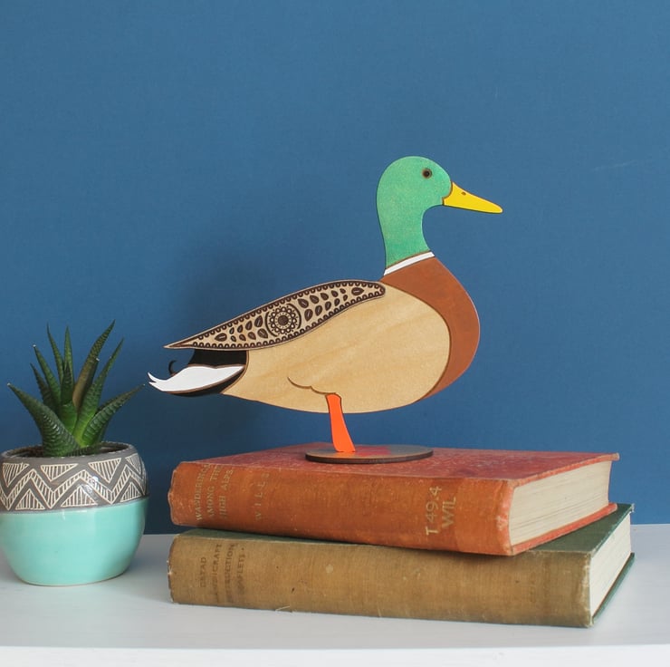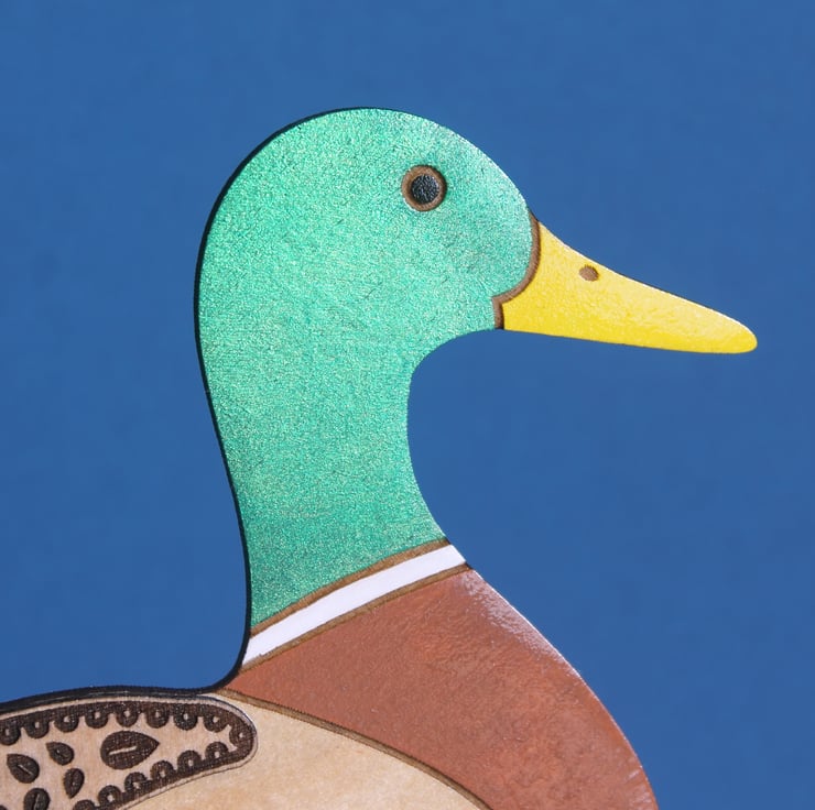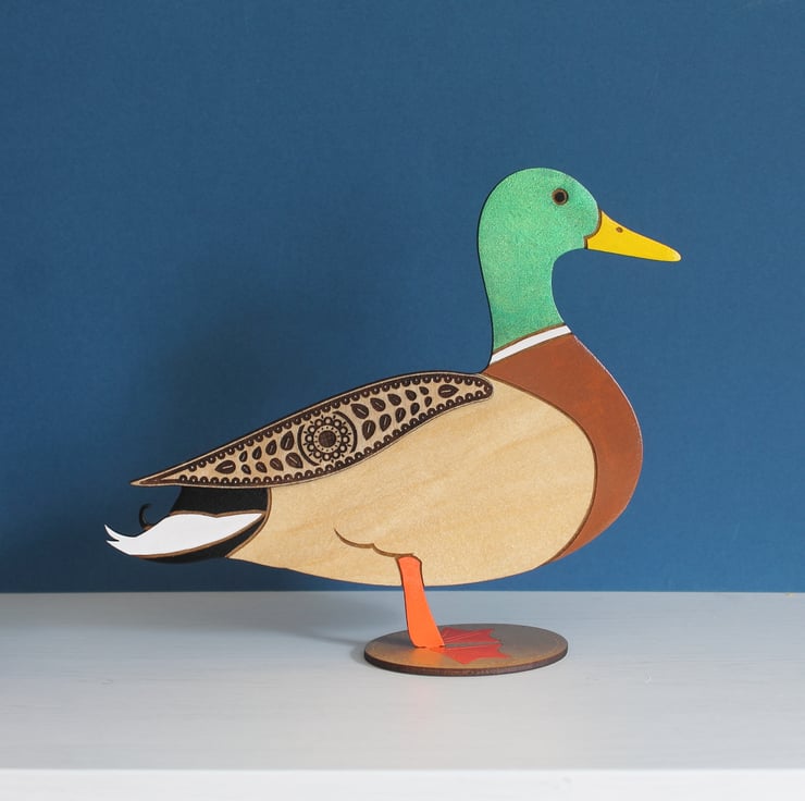 Cut from 3mm ply, this pretty drake has hand painted in a black, white and brown, and has a beautiful shimmery green head. He has a bright yellow beak and glossy orange legs and feet detail. He also features a etched wing with a pretty leafy, floral pattern. He’s finished with a gloss varnish to keep him looking lovely.