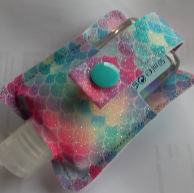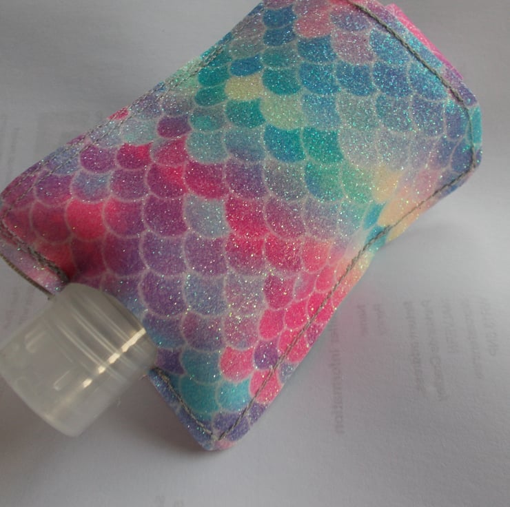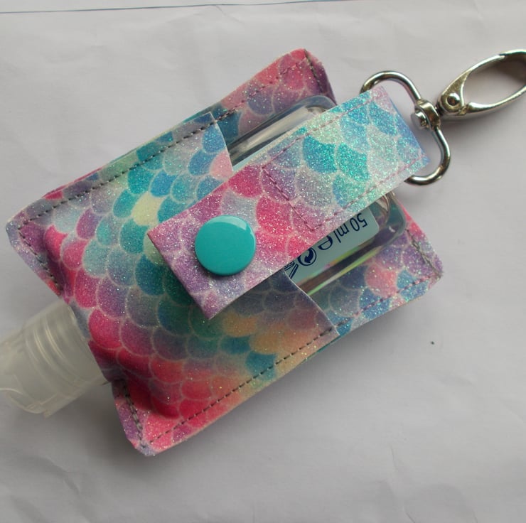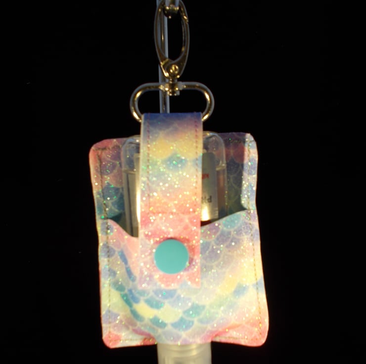 Beautiful mermaid scale glitter hand sanitiser holders, the glitter does not come off. This beautiful holder comes with a clasp that will clip to your bag, belt loop or through a button hole so your hand gel is always in easy reach.