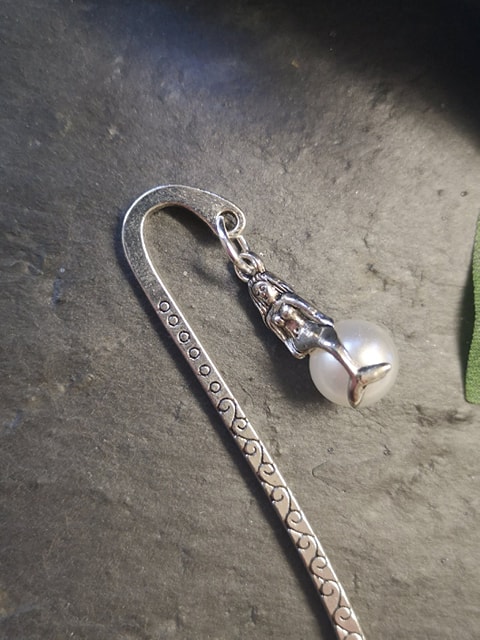 Mermaid charm bookmark. The mermaid sits on top of a glass pearl.