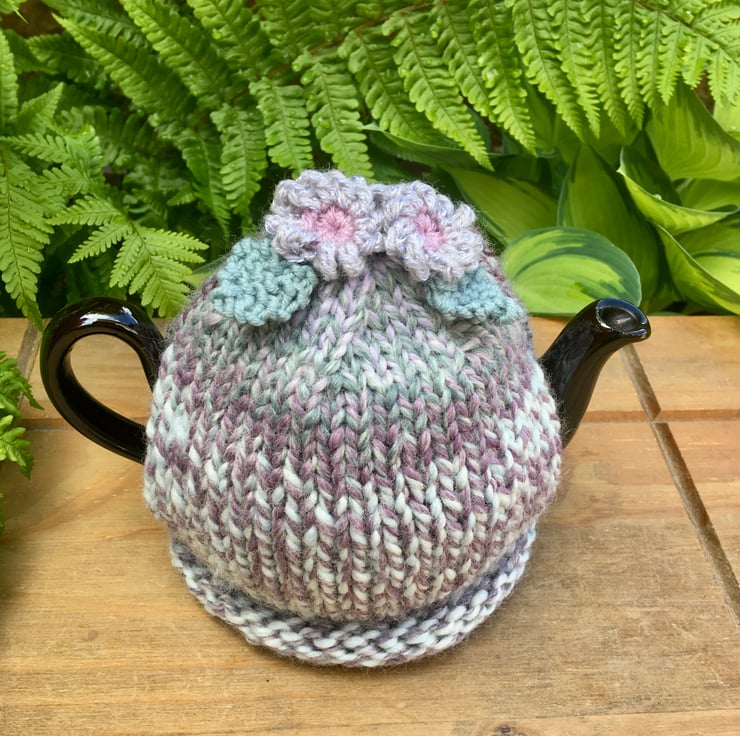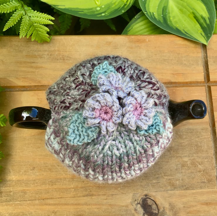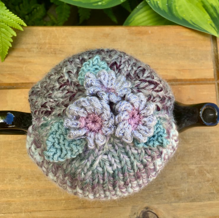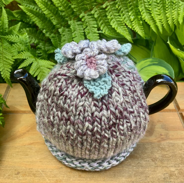I have hand knitted this tea cosy using a warm chunky yarn in marbled shades of pale duck egg blue, aubergine and mauve. There are three crochet flowers attached to the top in complementary colours. The flowers are grey with silver threads running through and a pale pink centre. The three leaves are duck egg blue. They are made using a mixture of cotton merino and acrylic yarns.