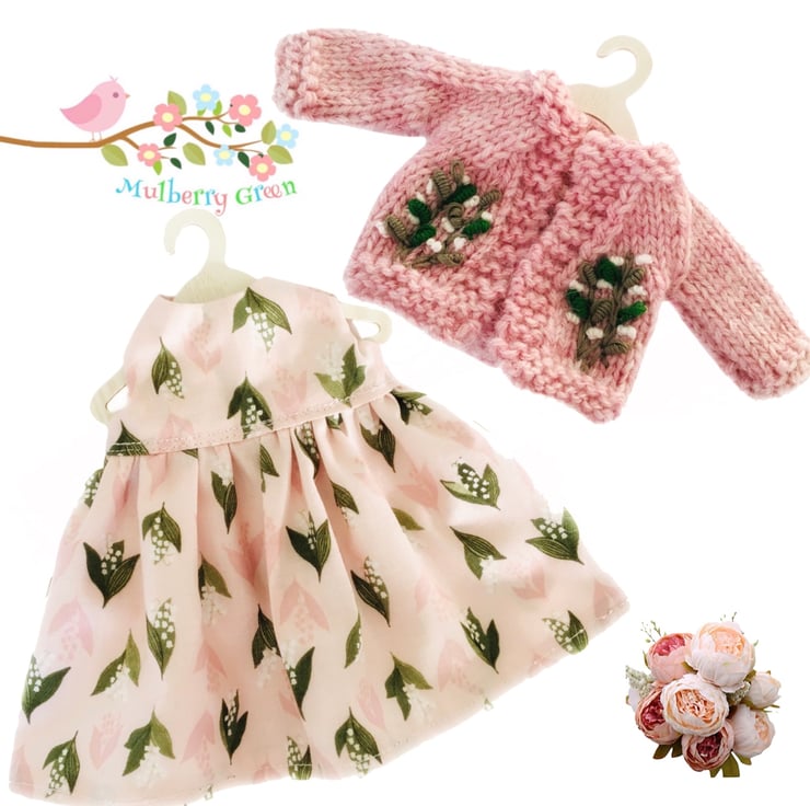 A gorgeous pale pink cardigan, embroidered with flowers, to fit the Mulberry Green characters. The cardigan is hand knitted and comes on a cute little wooden hanger. It matches the lily of the valley dress.