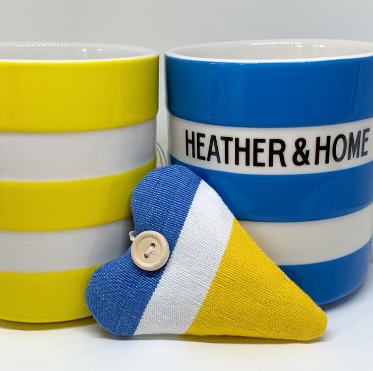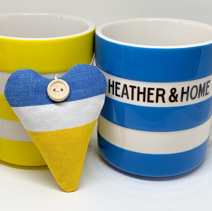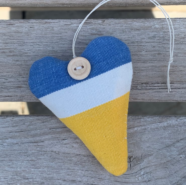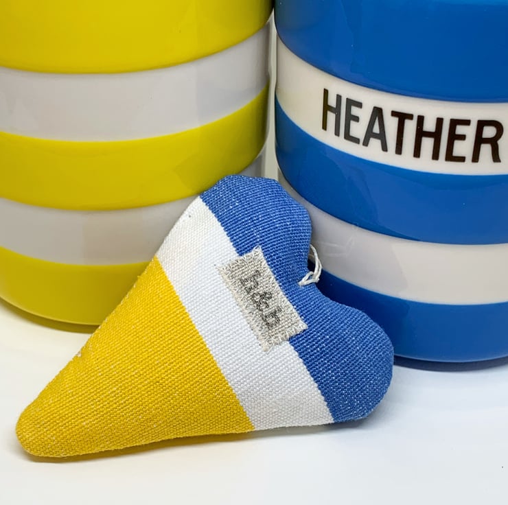 In a cheerful blue, white and yellow stripe and generously filled with fragrant locally grown lavender (or if lavender isn't for you, why not opt for a filling of high-quality toy-grade stuffing instead?) - this heart is hand-finished with a little round wooden button and a hemp twine hanging loop.