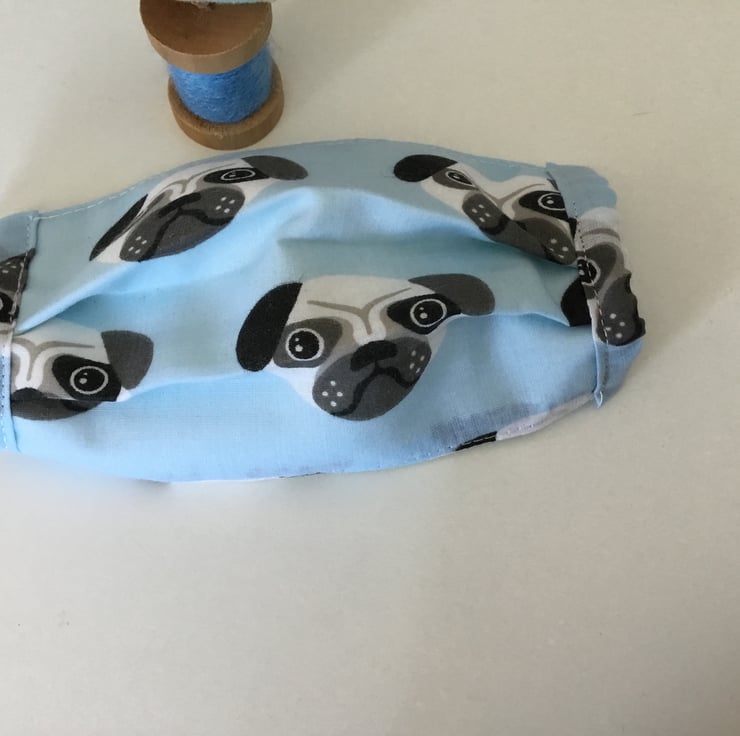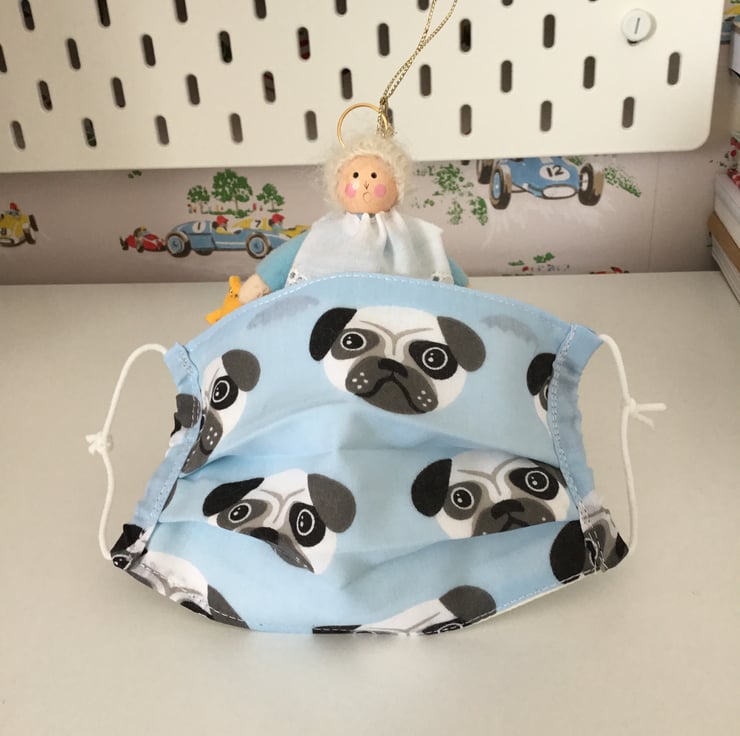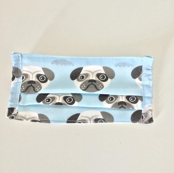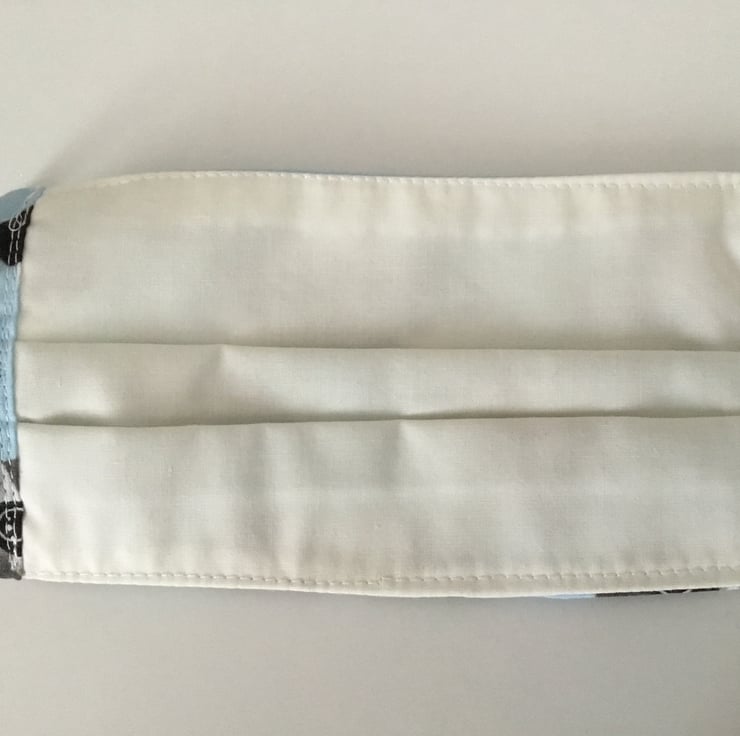 Child’s triple layered fabric face covering with elastic ear loops to be adjusted for size.
