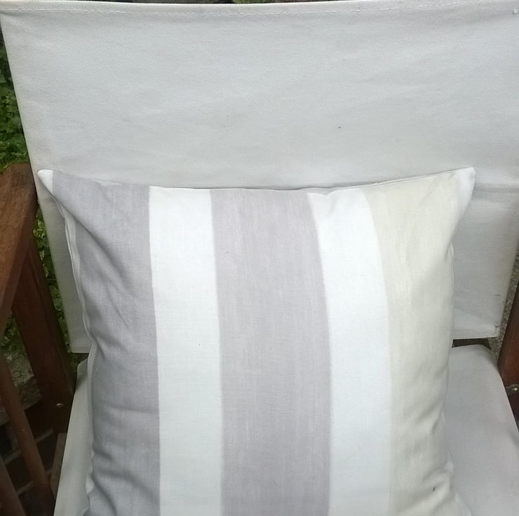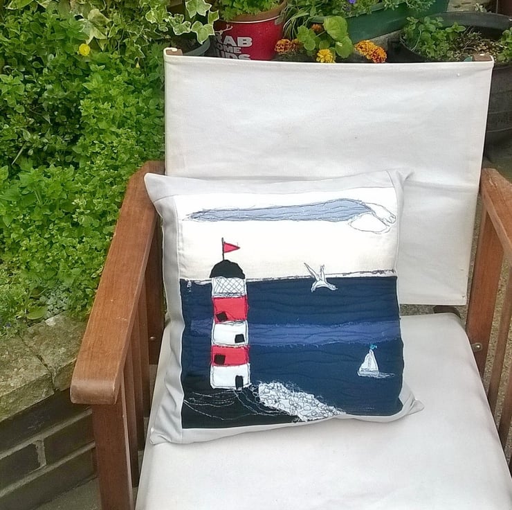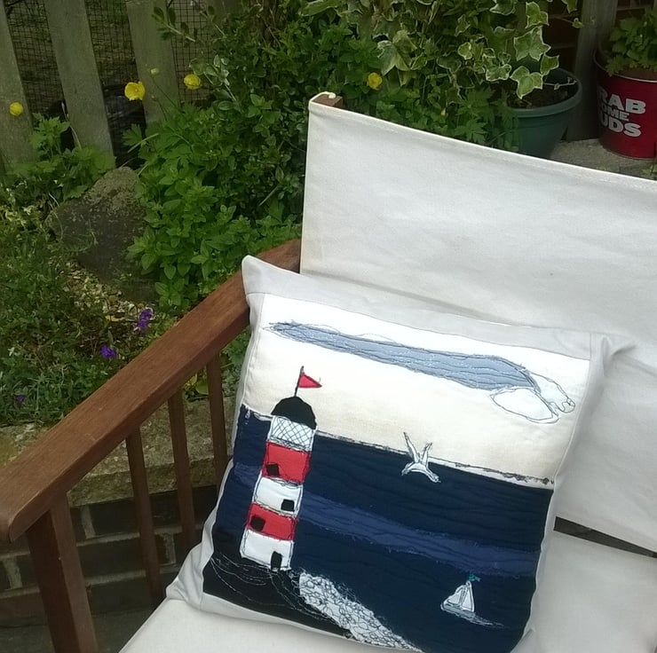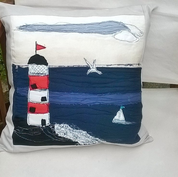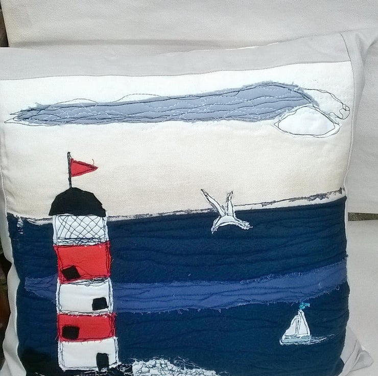 This Lighthouse and seascape design cushion cover has a freestyle machine embroidery applique raw edge design . I have used different fabrics to create this coastal picture. It has a border to frame the picture and has Prestigious Textile stripes fabric on the reverse with a hidden zipper fastening.