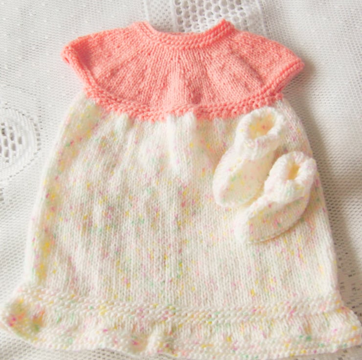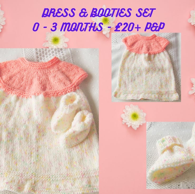 Beautiful 2 Piece set including sleeveless dress and bootees hand knitted in double knitting yarn.