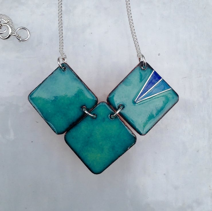 This sweet necklace is made up of 3 x squares each 20mm from copper. I have enamelled each and added a silver design on the one square, adding different colour enamels to and in between the silver. They have been fired 3 times to 800 degrees C. The length of the sterling silver chain is approx.17 inches so hangs neatly around the neck.