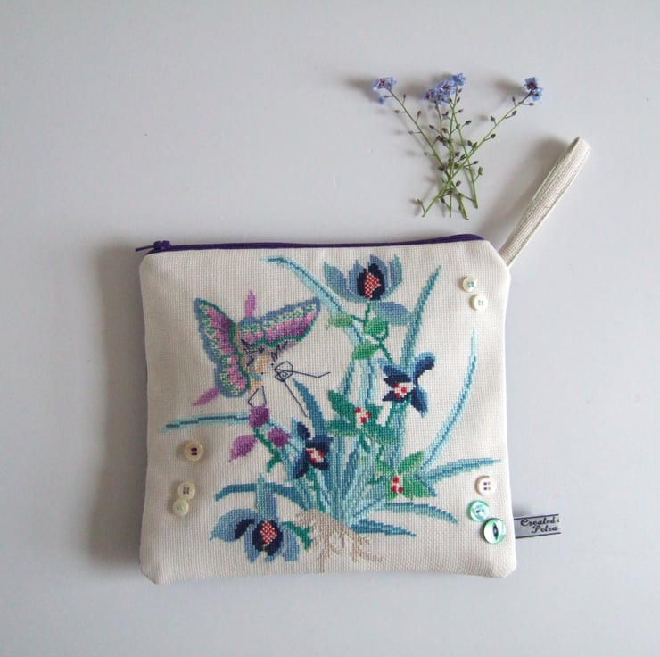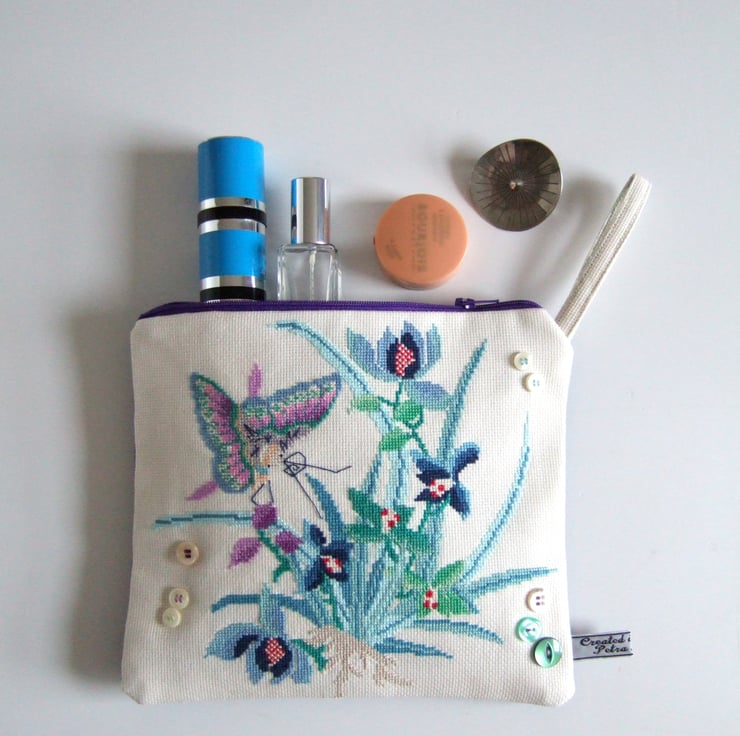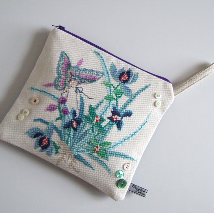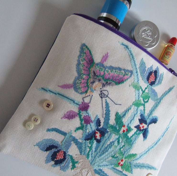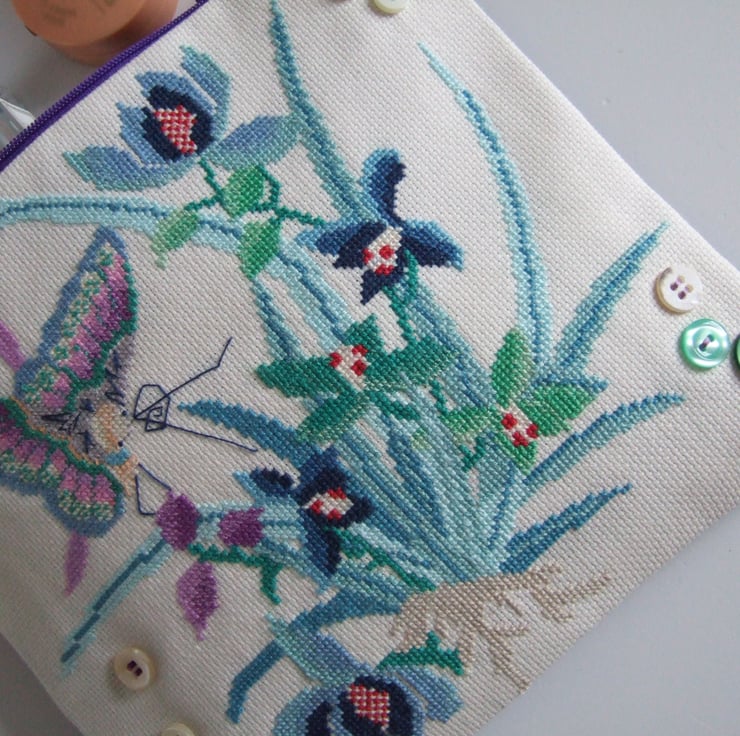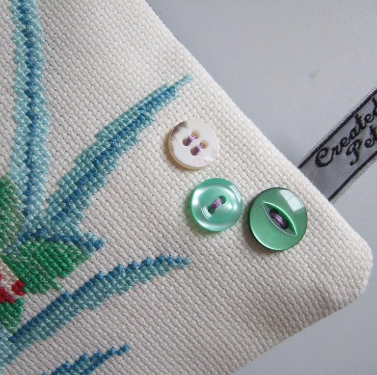 I have made this pouch or make up bag from a fabulous little vintage embroidery sample. It features a pretty butterfly amongst the flower borders, and is sprinkled with little vintage buttons.The unusual combination of muted blues, greens and lilac embroidery thread make this little bag a bit special. It would make a lovely present for someone who is learning to embroider, for a vintage textile fan, or for someone who needs a virtual hug right now.