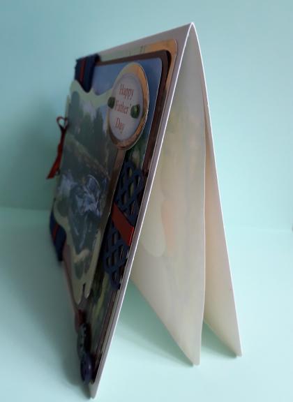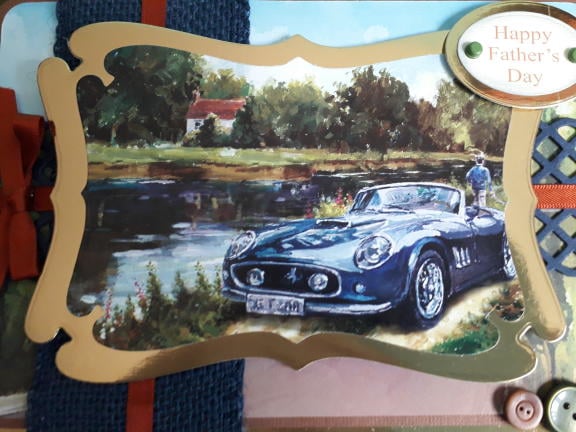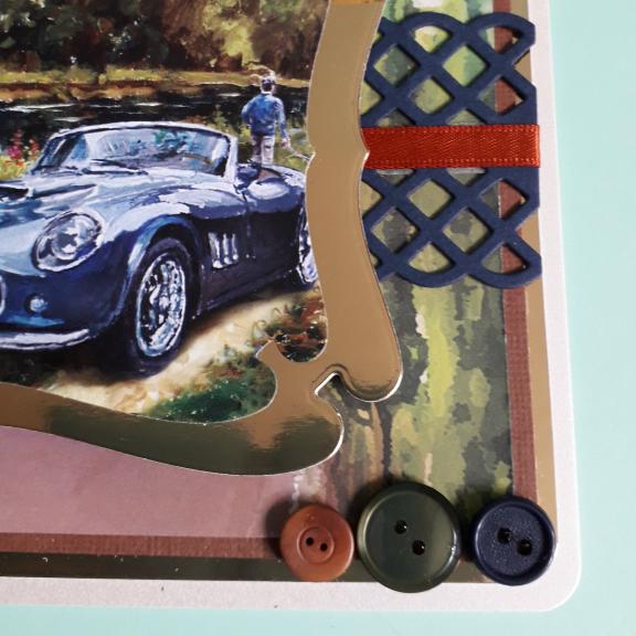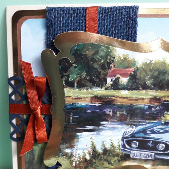 This A5 card features a picture of a blue sports car in a riverside setting. I have placed the picture in a gold frame then onto a background picture of a country road, (possibly in France), then brown linen effect card, gold card and an ivory pearl base card.