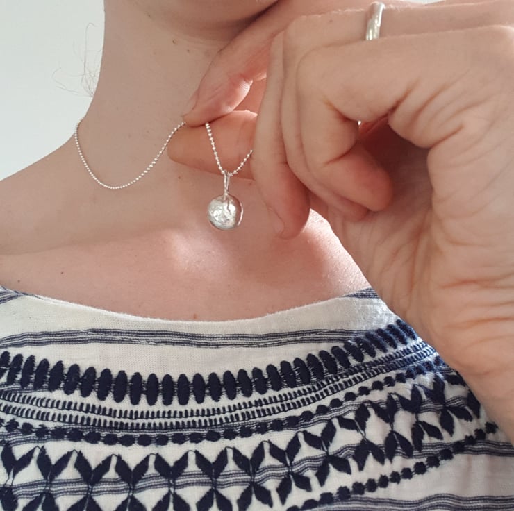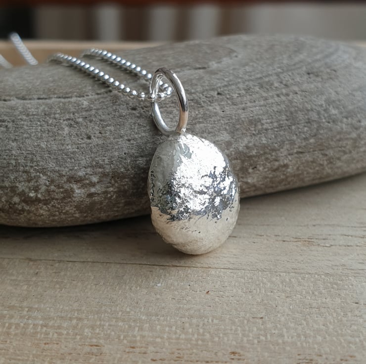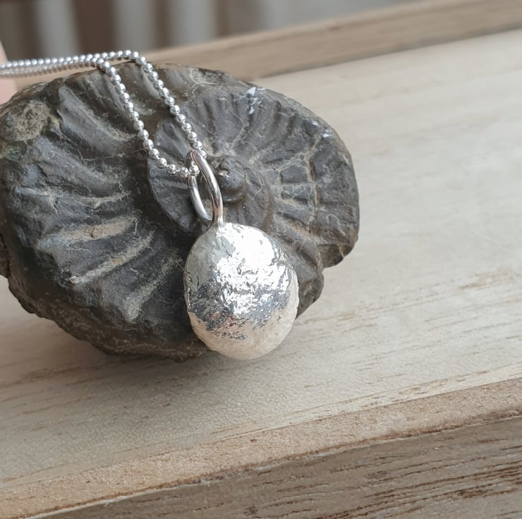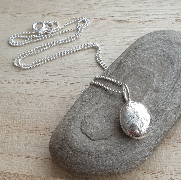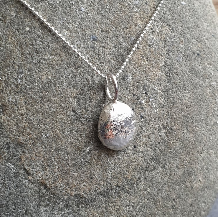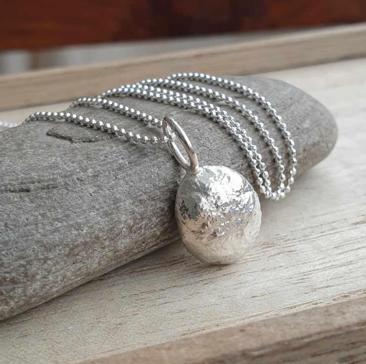 This recycled silver pebble pendant was made by melting down scrap silver leftover from other projects. The silver nuggets are all unique as each one will vary slightly in size, shape and surface texture. I've attached a simple silver ring bail and hung the pendant from a sterling ball chain, for a clean, contemporary look.