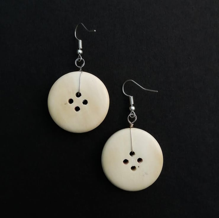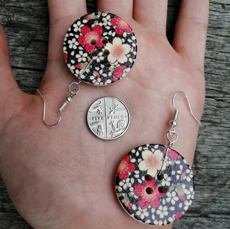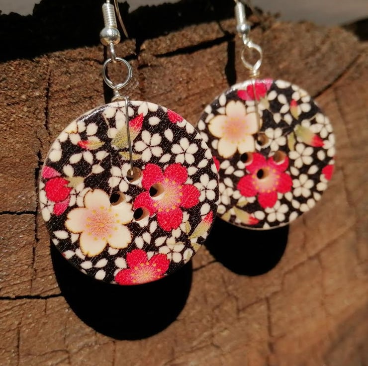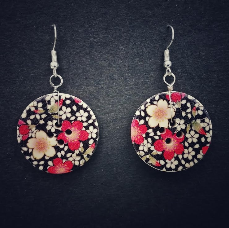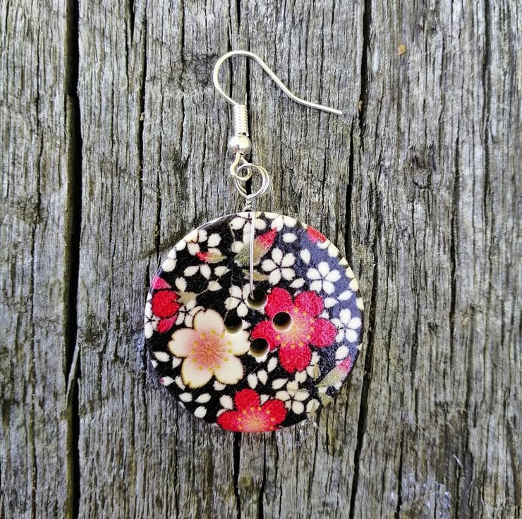 These unique drop earrings are large wooden buttons, with a lovely vintage pattern of red and white flowers on a black background. Even though they are wooden, they are still light and easy to wear, making them a perfect vintage touch to your fun, everyday outfit.