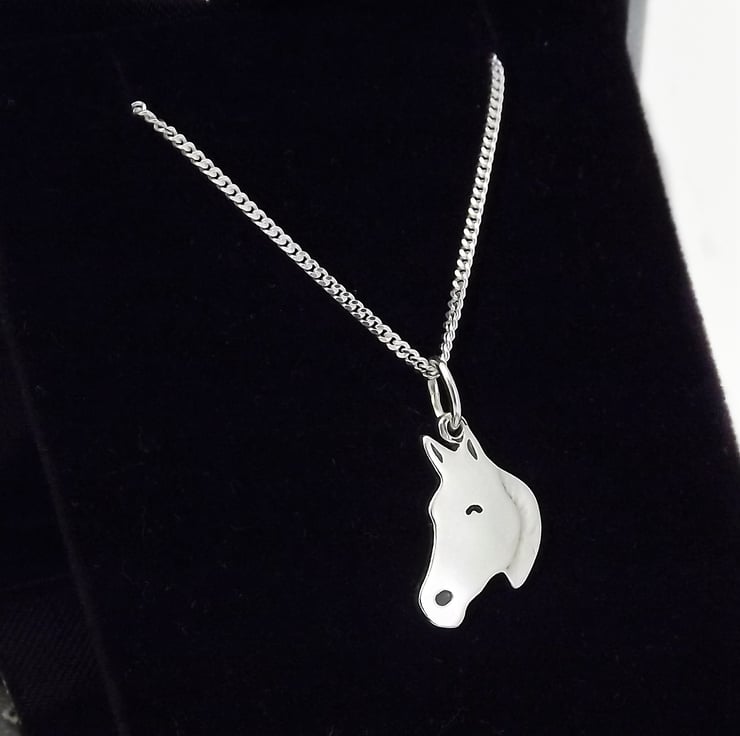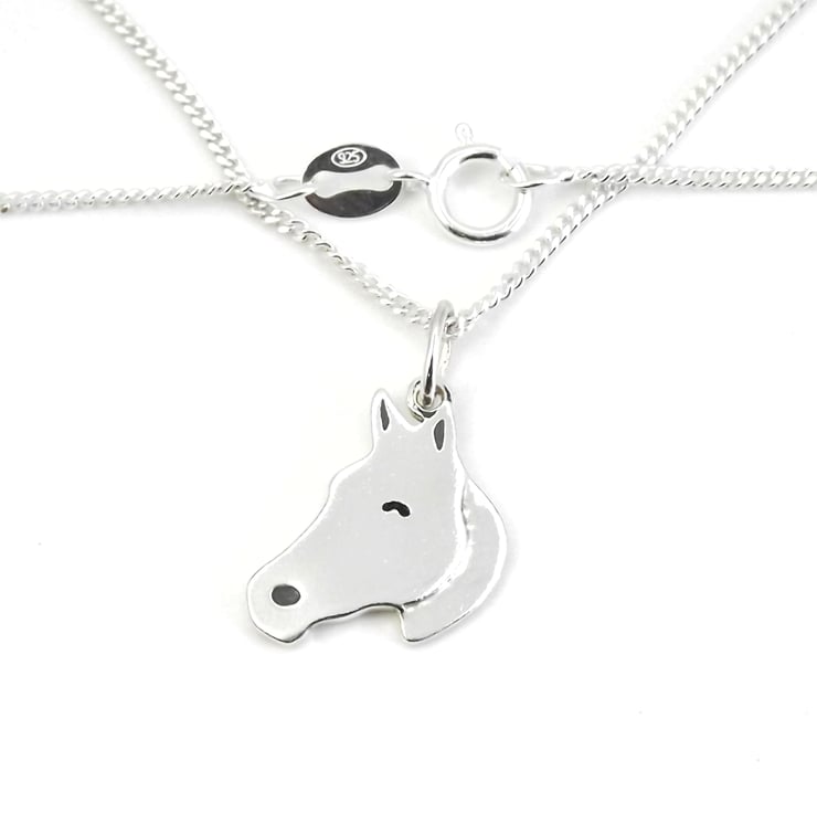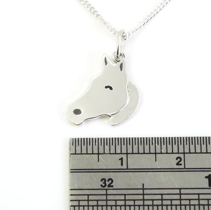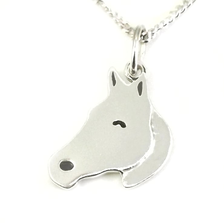 This small horse pendant has been lovingly handcrafted in Shropshire. It is made from recycled sterling silver sheet and is etched before being cut by hand, the edges are then smoothed using files and emery paper before it's carefully given its shape using a punch and hammer. A 5mm oval jump ring is then attached. Grey and black resin based enamels are added to the etched areas and the piece is then polished before being attached to a chain.