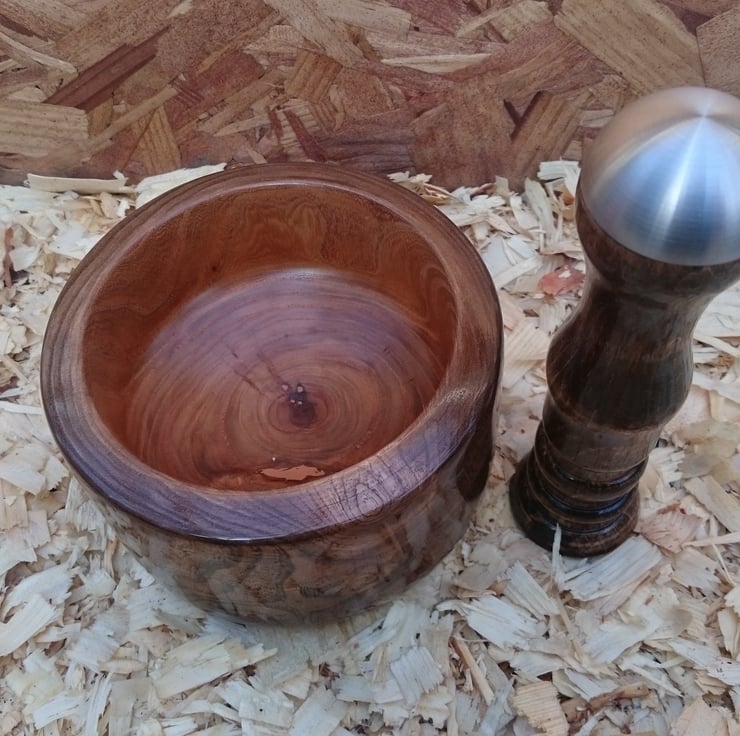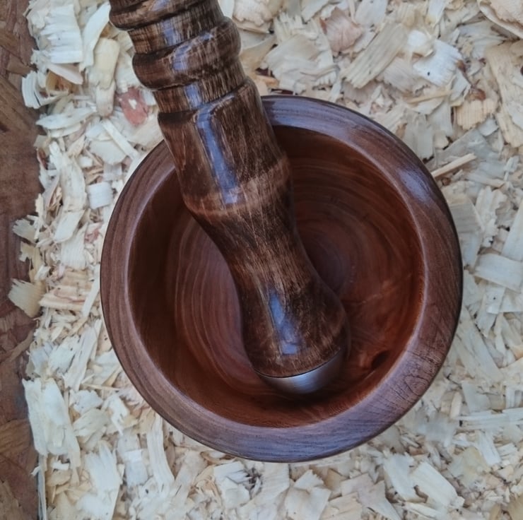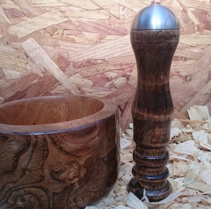 The Pestle is a solid Stunning Bowl with matching Mortar. The beautiful grain pattern in mid/dark brown has been polished to a glass like finish and the inner bowl has been coated with a Food safe treatment. The Mortar has a unique design with a large stainless steel cap to ensure great results. The Pestle is; 135x80 & Mortar 180x45.