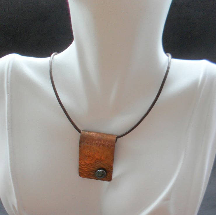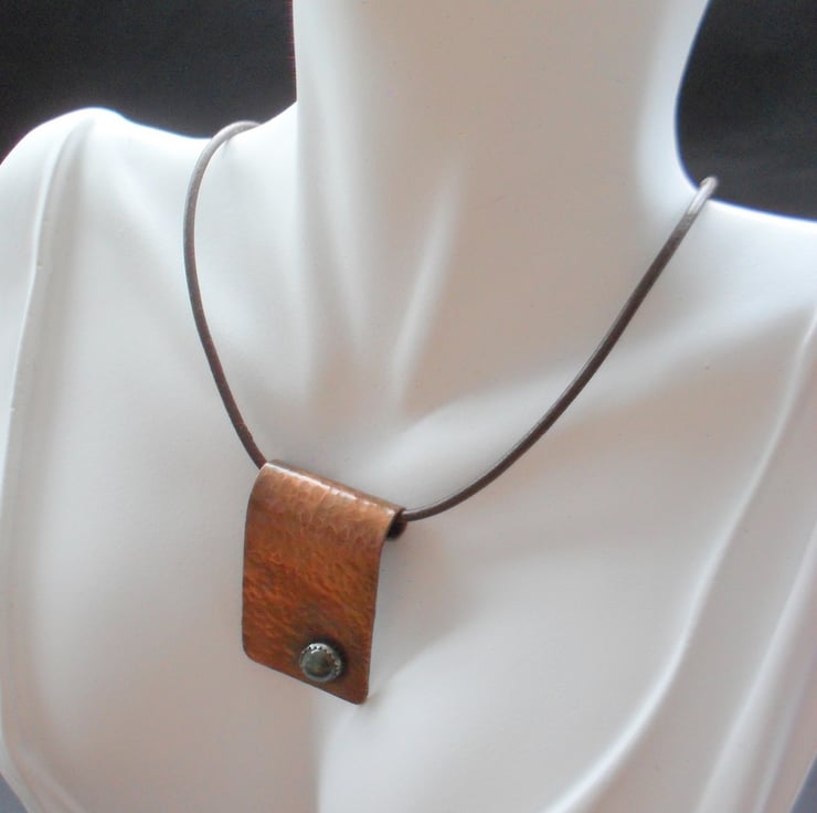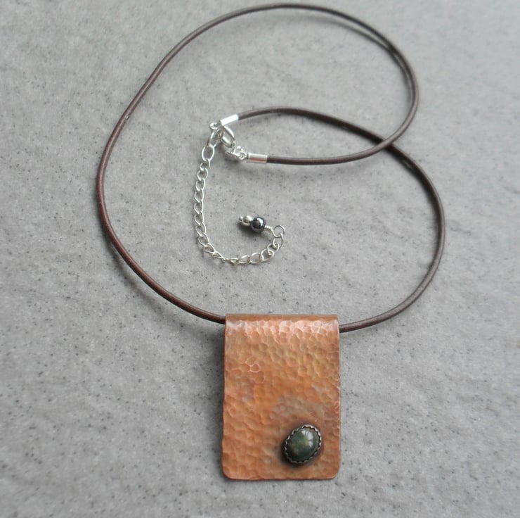 Copper pendant has been cut from a sheet of copper ,sanded, hammered to give texture and has a bloodstone semi precious gemstone which has been bezel set on to the copper with a sterling silver bezel. Then the pendant has been oxidised to give an aged look and has had a lacquer.coating
