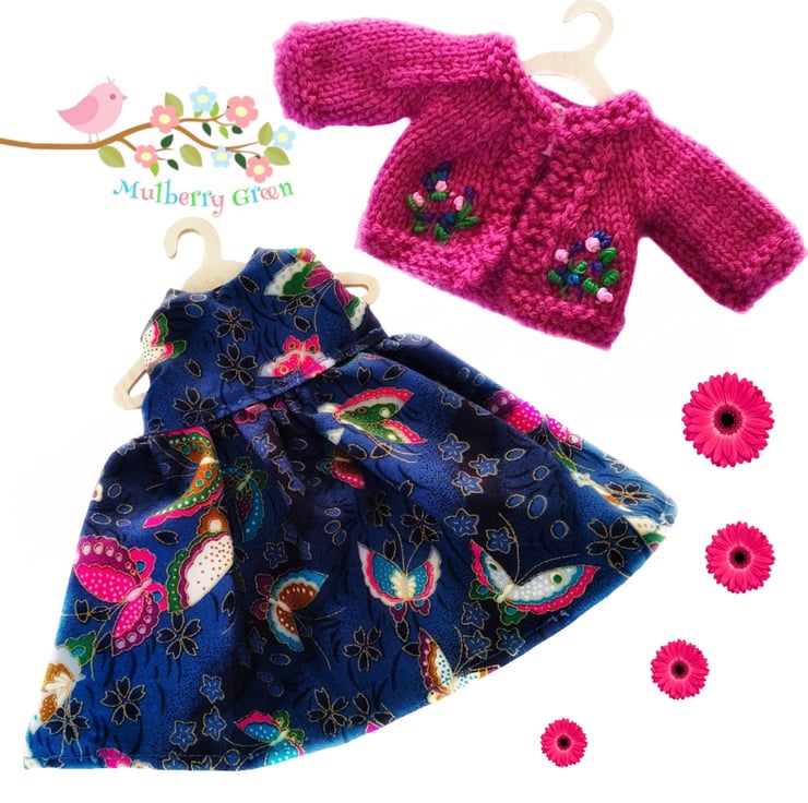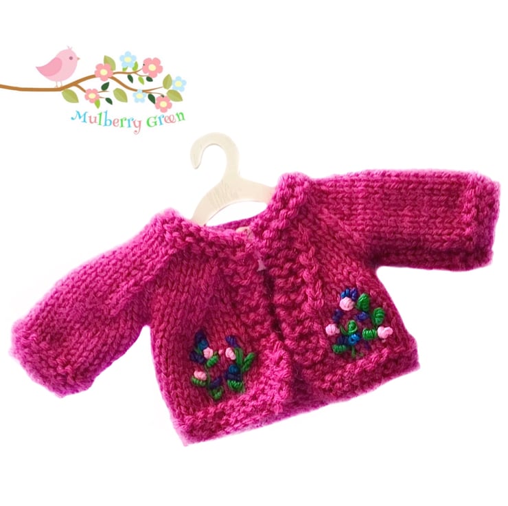 A pretty magenta cardigan, embroidered with flowers, to fit the Mulberry Green characters. The cardigan is hand knitted and comes on a cute little wooden hanger. It matches the blue and magenta butterfly dress.