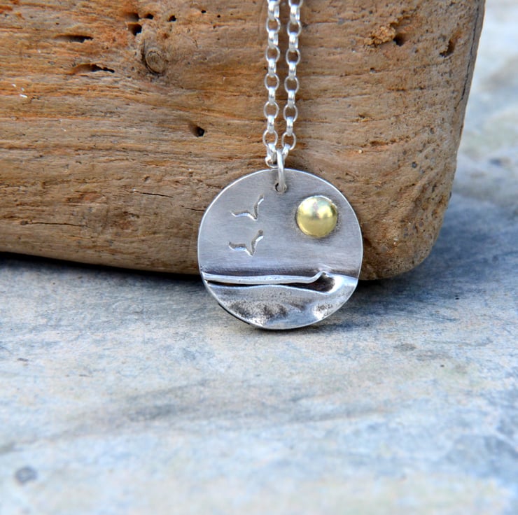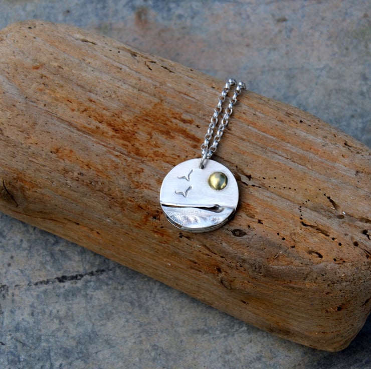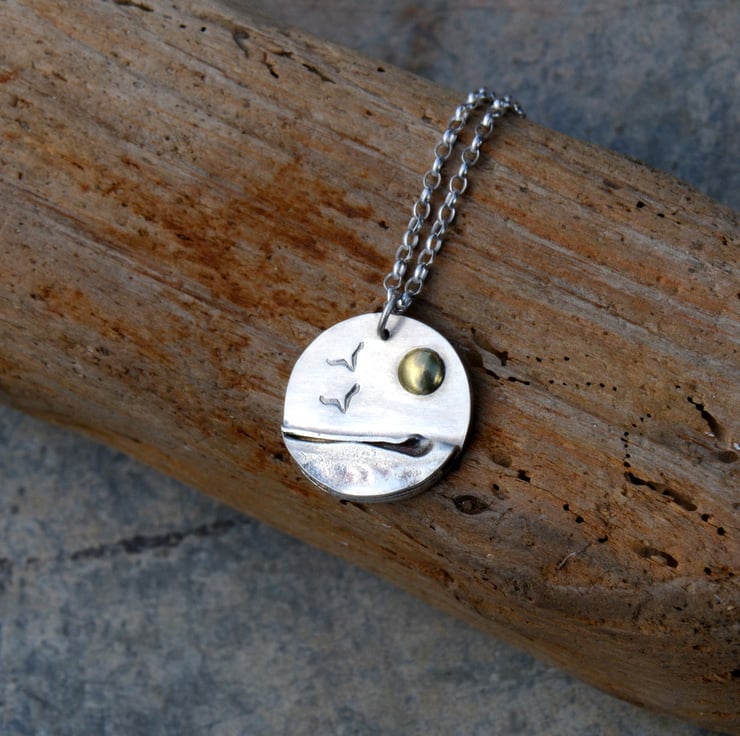 This pendant is inspired by my love of the coast, Measuring approx 17mm across it is handmade in sterling silver with a layer of folded fine silver to represent the sea. It has a tiny brass sun and is stamped with a seagull flying in the wind. The pendant has been oxidised to give the effect of a hazy sky. A perfect gift for someone who loves to travel or loves the coast. It comes complete with a sterling silver belcher chain which fastens with a bolt clasp.