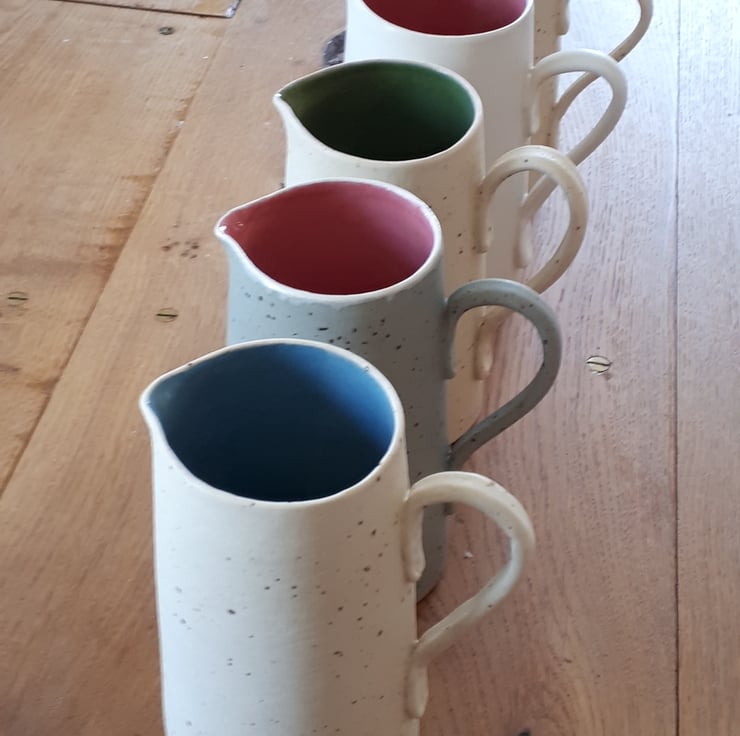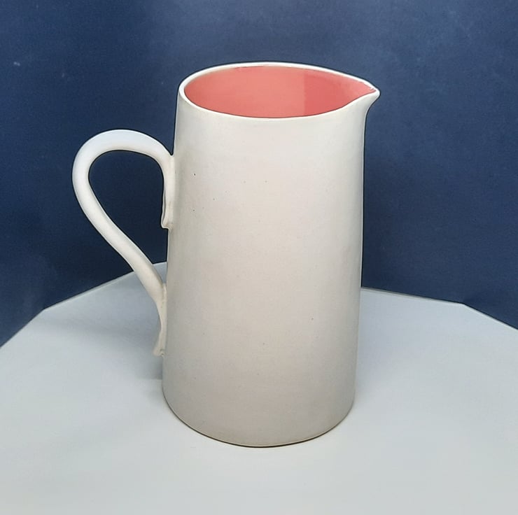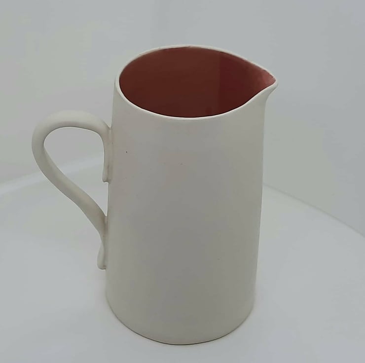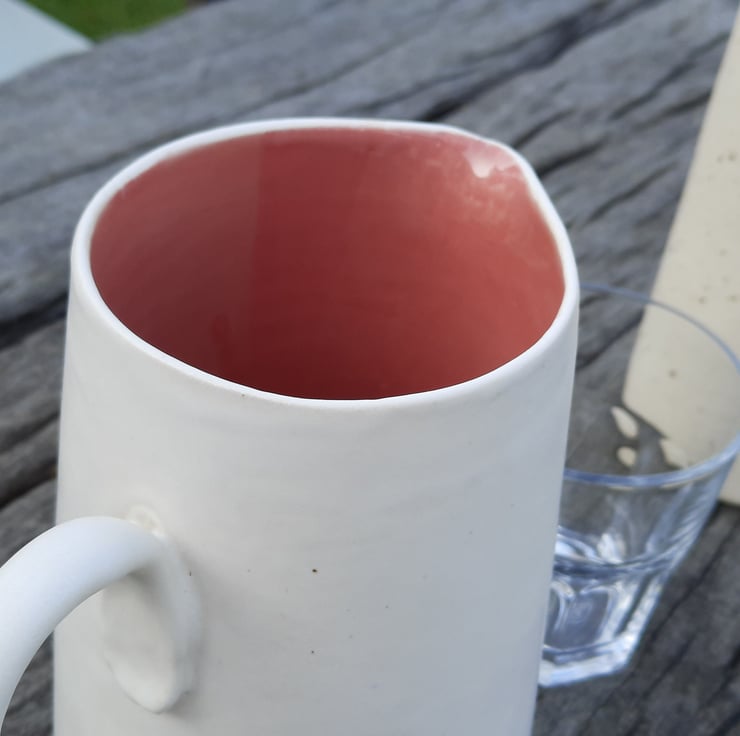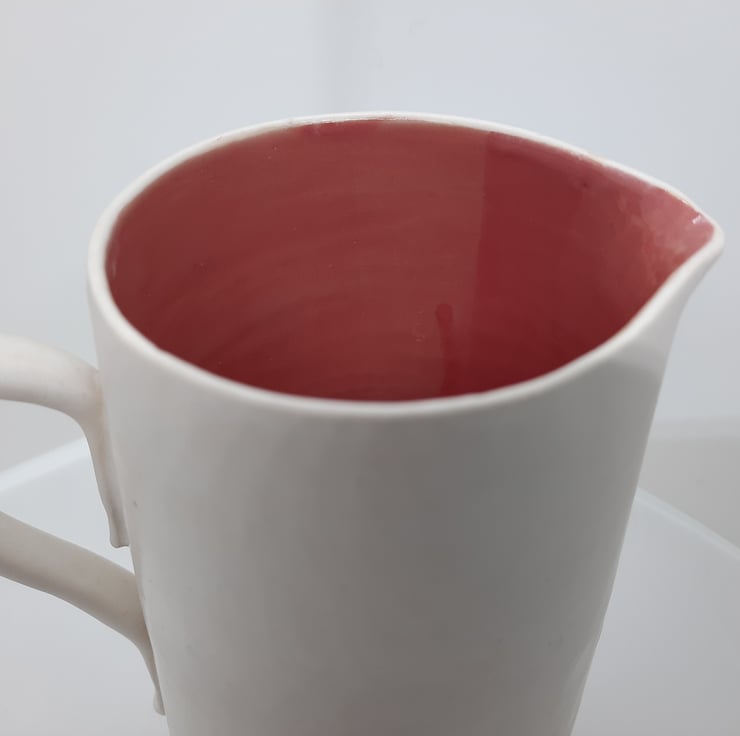 A raspberry pink and white jug. The inside of the jug is glossy raspberry pink combined with a satin white glaze on the outside.