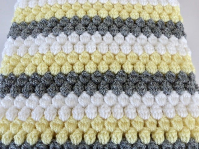 A crocheted blanket in grey, lemon and white 100% acrylic yarns so it can be gently washed. I have used a four stitch bobble pattern for this item, with a wide white border, and it measures approximately 28" x 24" (70cm x 62cm) so is ideal for a pram, pushchair, moses basket or car seat. The colours are suitable for a boy or girl and it would make an ideal baby shower gift. This item will be sent by Royal Mail packed to arrive safely.