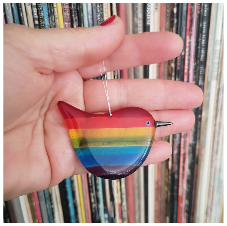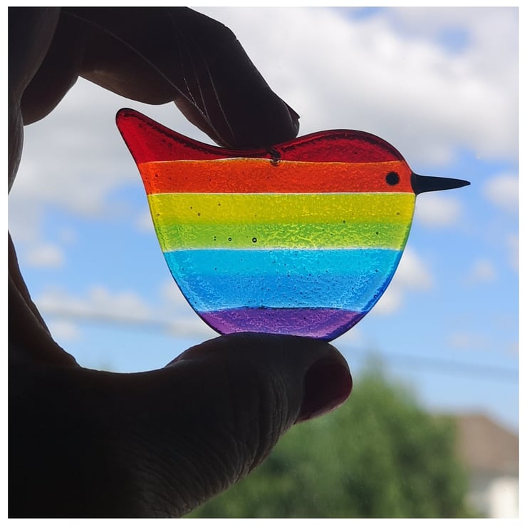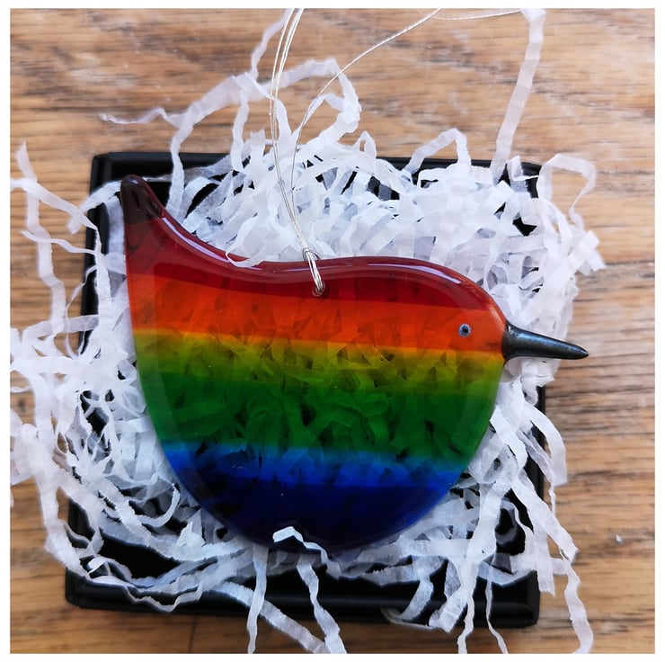 This purchase is for one chunky medium 'Rainbow Wren of Hope' with a red back. He is suspended from a length of silver thread so you can hang him in the window to spread a little hope and colour into your home and neighbourhood.