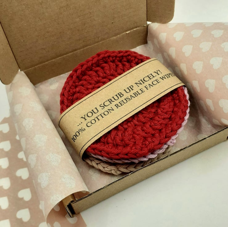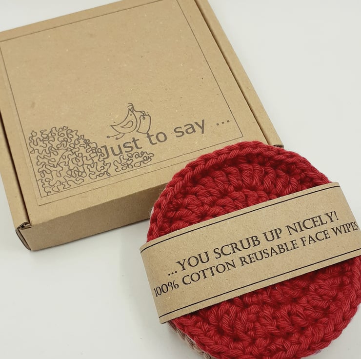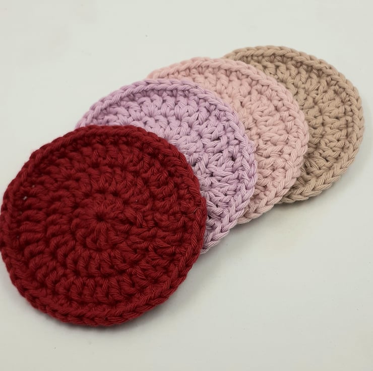 These four pretty face scrubbies are crocheted in cotton and measure approximately 7.5 cm in diameter. Perfect for use with soap and water or makeup remover. They can be popped in a laundry bag and washed at 40 degrees, reshaped whilst wet and they are ready to use again!
