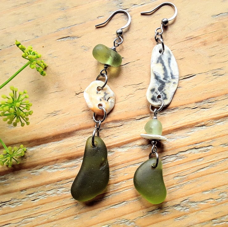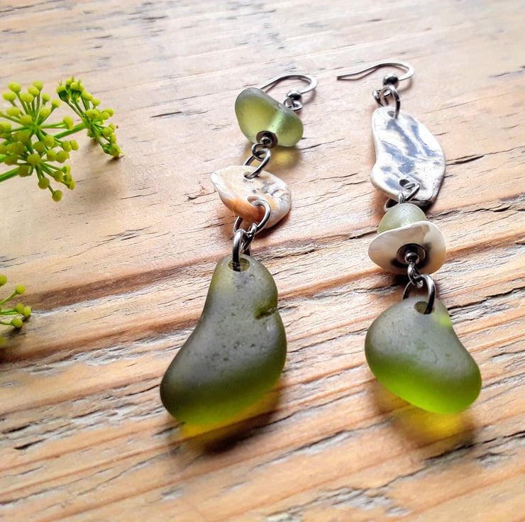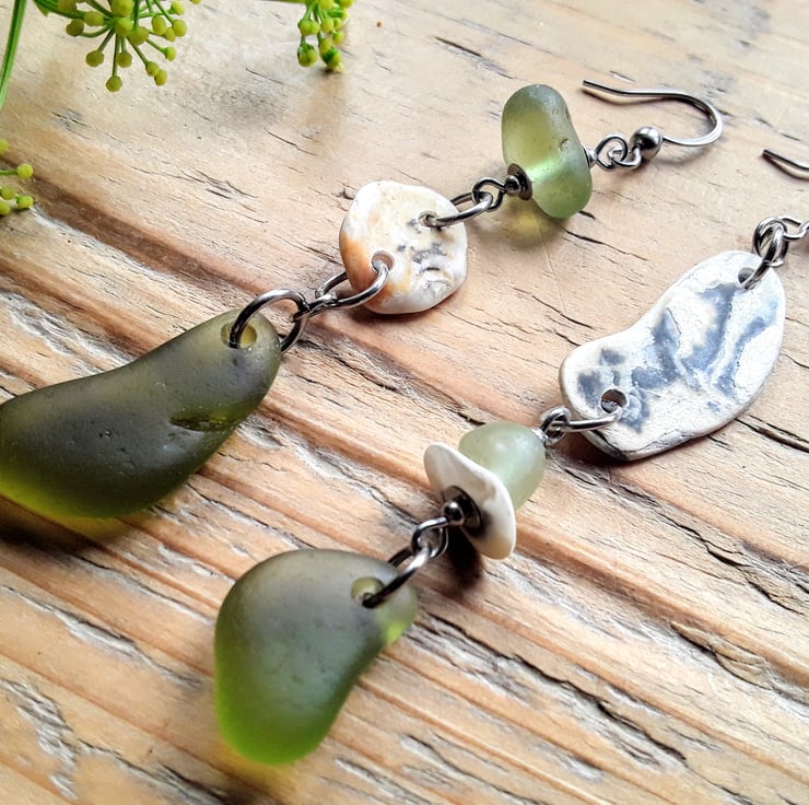 An unusual and interesting asymmetrical collection of sea-worn oyster shell fragments, teamed with olive green seaglass pieces, linked together with stainless steel rings and beads.