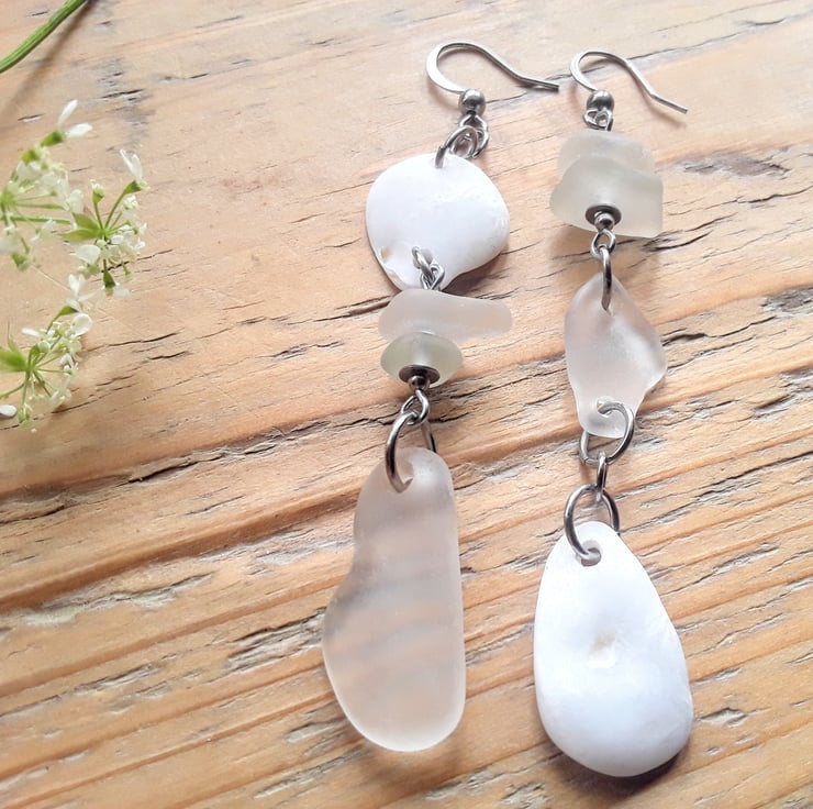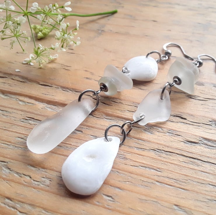 An unusual and interesting asymmetrical assemblage of sea-worn mother-of-pearl shell fragments, teamed with white sea-spray seaglass pieces, linked together with stainless steel rings and beads.