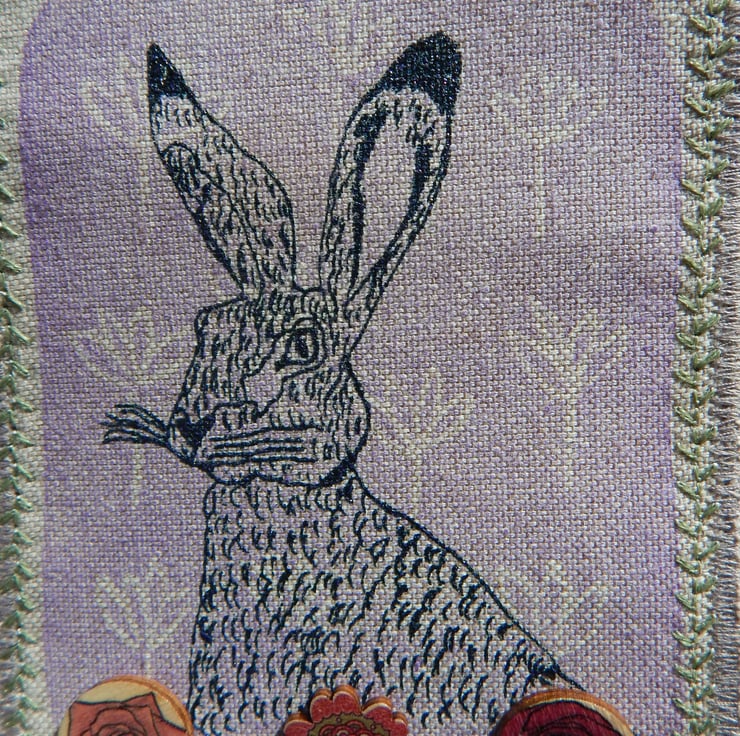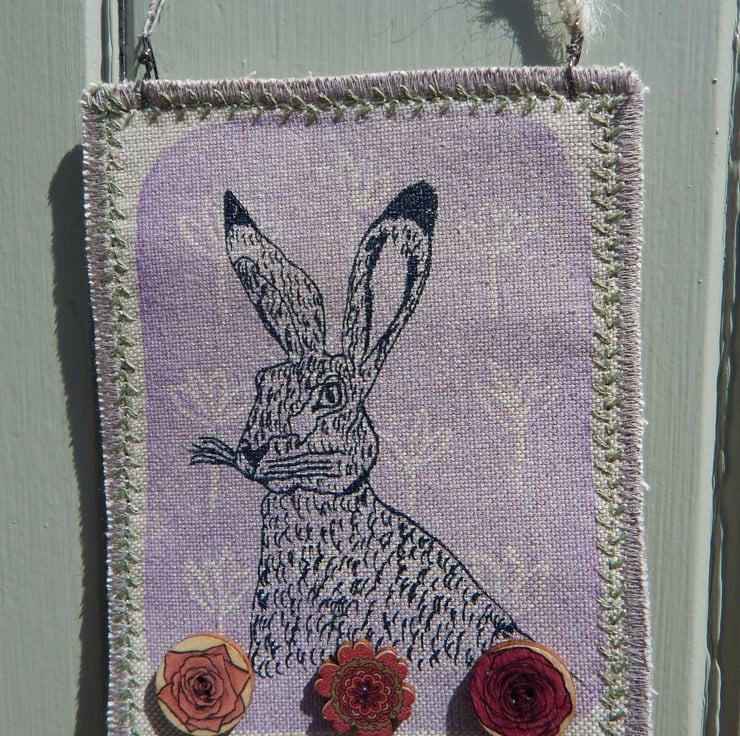 This is a fabric hanger that I have screen printed a hare onto, on top of a lino print with simple flowers. There are 4 layers of interfacing between the front and back fabric to give some stability. I have then attached 2 simple metal fixings on top to pop some nettle string to for hanging. The edging has a zig-zag stitching to prevent fraying and then some green decorative machine stitching on top of this. There are 3 wooden buttons at the bottom.
