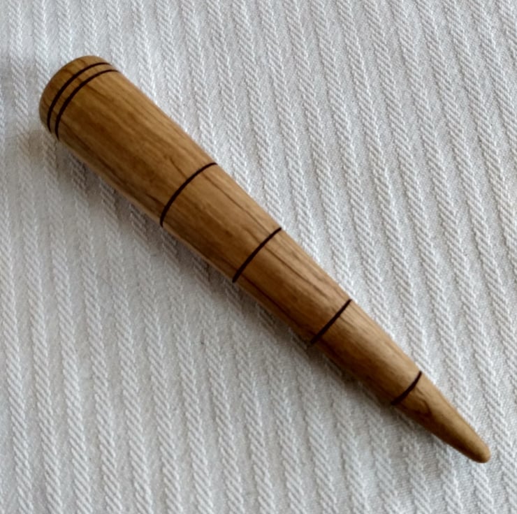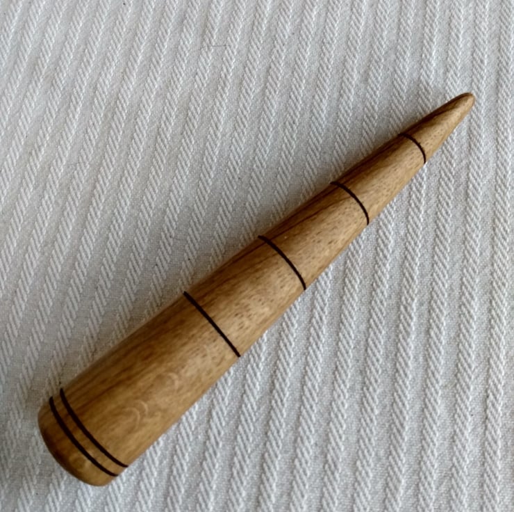 Contemporary style for the modern gardener. Lines are in inch marking that are burnt black by friction when I turn the wood which is stunningly grained re-cycled oak. The handy tool that makes pricking out and potting on a pleasure. Very comfortable fit in your hand and silky smooth. Has a linseed oil finish on this, more than 100 yr old wood - super durable - it won't mind the soil or wet, if you leave it outside by accident and it's patina will improve with use.
