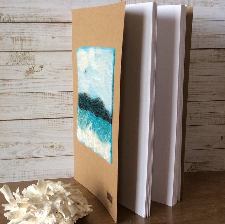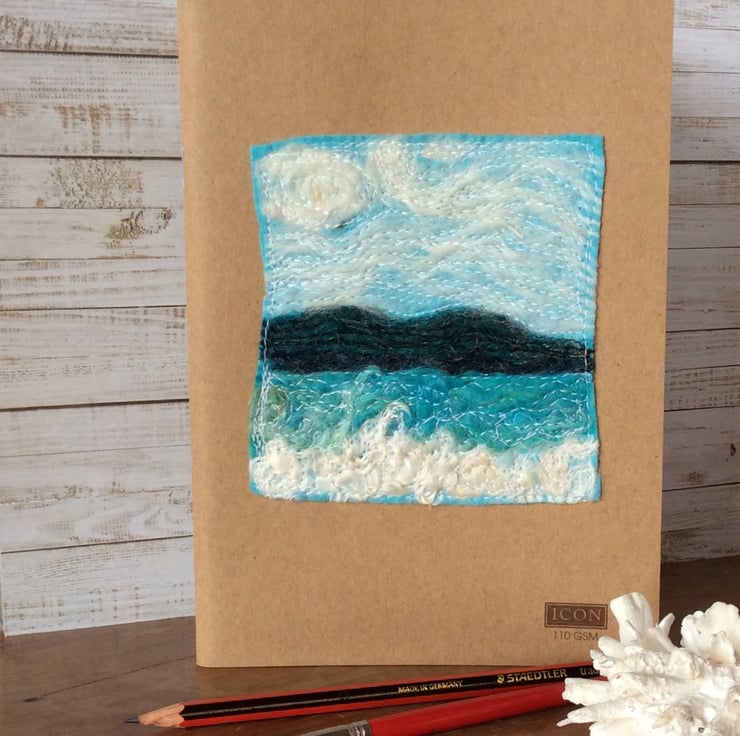 A5 sketchbook with plain 110 gsm paper and an embroidered brown card cover. It’s enhanced with an atmospheric needle felted seascape with free motion embroidery. It’s ideal for drawing, journaling, scrapbooking, painting or doodling. It’s also handy for pockets or bags. The stapled sketchbook is made from paper and black card, measures 15 x 21cm, contains 40 pages (80 sides). The artwork measures 11 x 11 cm.