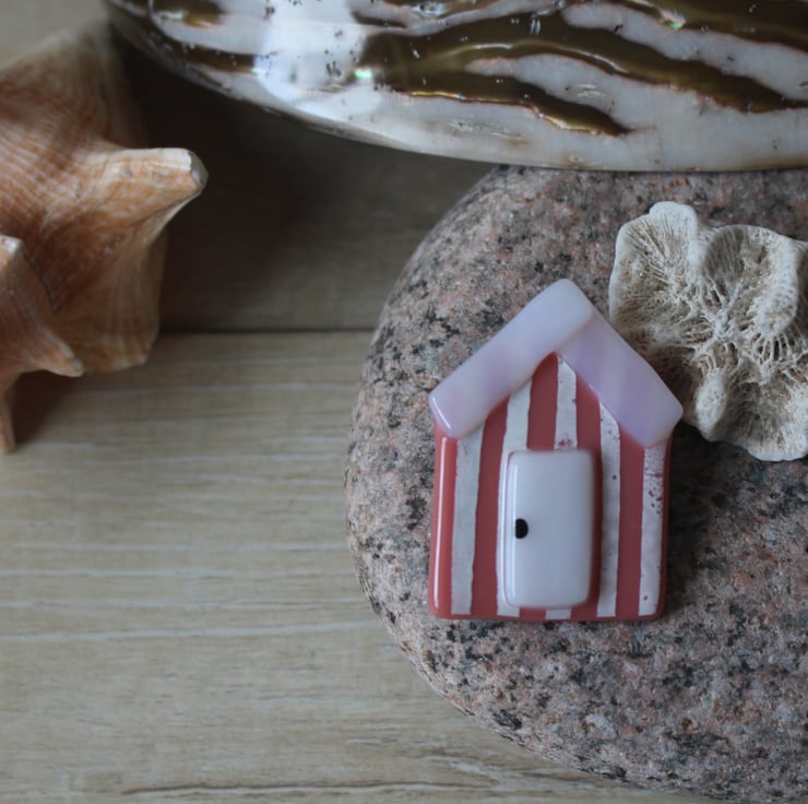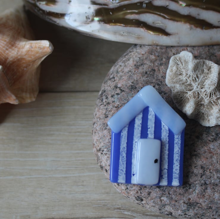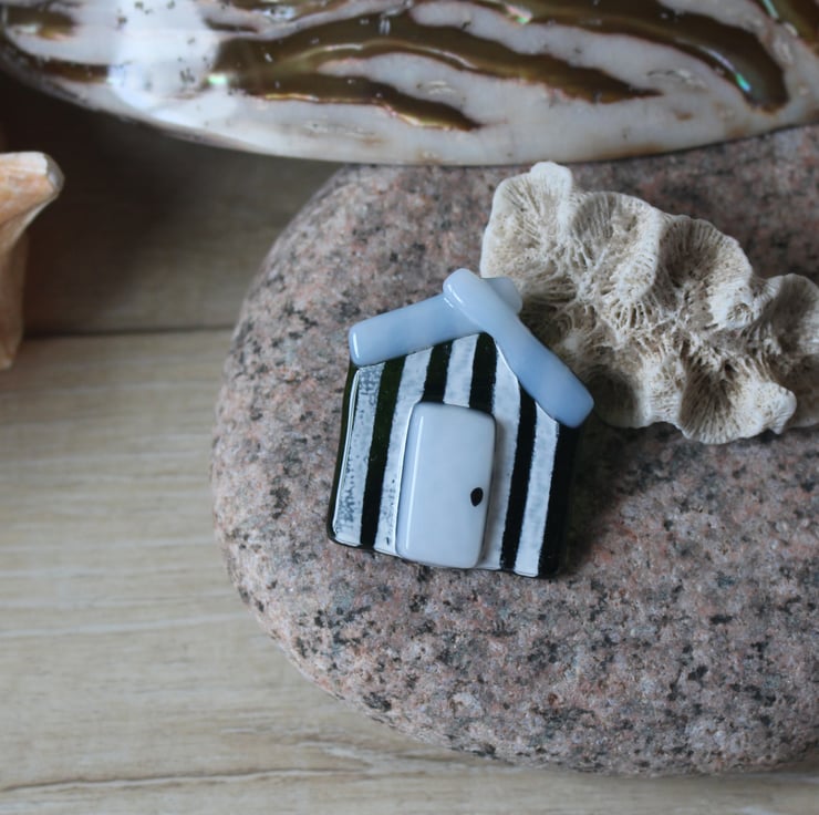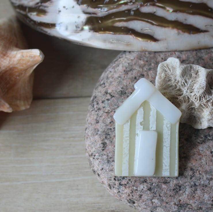 This listing is for a single unique beach hut brooch made from fused glass. I have several in different colours. Each beach hut is hand cut, enameled (to give it that distressed, washed out beach hut look) assembled and fused. They normally go on to my beach hut panels, but I thought some of the beach lovers out there might like one to wear as a brooch. Each brooch is approx 3 cm x 5 cm in size, and is supplied with a stainless steel safety brooch back attached. Some are made of opaque glass, some translucent glass.