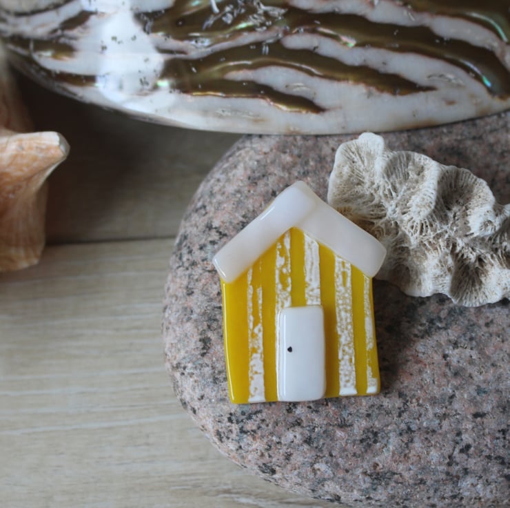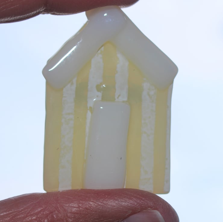 I make seaside themed glass panels - usually incorporating beach huts. When I began to make the last batch of beach hut scenes, I thought that the huts would look quite cool as a brooch or badge. I had kiln room at the time, so I thought I'd make a few extra - got carried away, and filled up the kiln. I now have almost 50 beach huts - in a range of colours. I have a mixture of both pastel colours and primary colours available