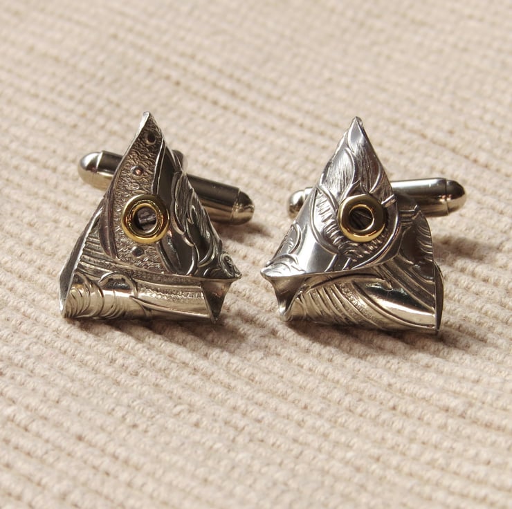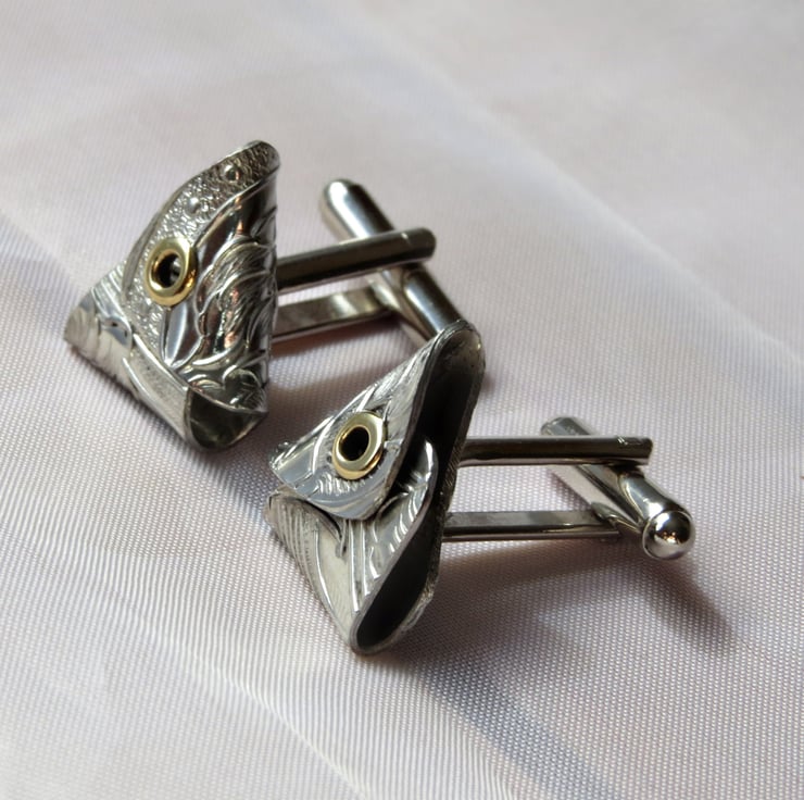 These cufflinks are part of a range called "Hook, Line & Sinker" which won first prize at The Worshipful Company of Pewterers Open Live Competition 2014 and were inspired by Jim's love of Fish. He had tropical fish as a child and numerous coastal holidays. He was always fascinated by rock pools and in spotting fish in the harbours (he still is!) and walks along the river to work fish spotting as he goes! Jim works from a small workshop in Sheffield and crafts these using traditional techniques.