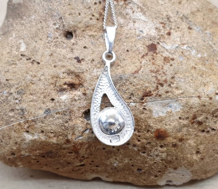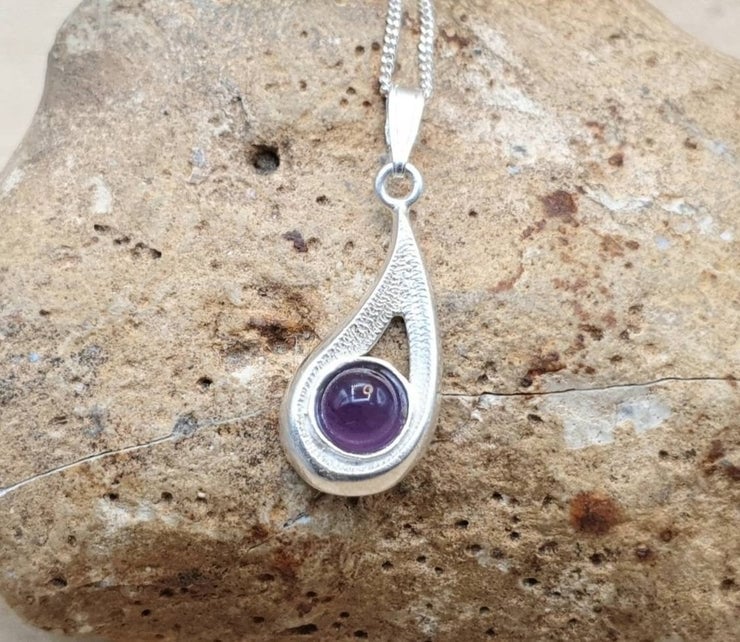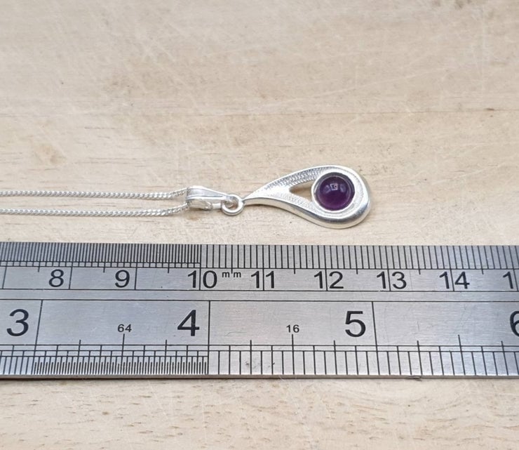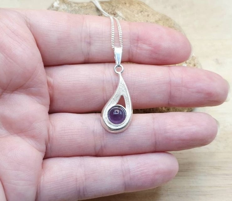 This is a lightweight (the silver has a hollow back) women's minimalist small teardrop sterling silver amethyst pendant necklace.