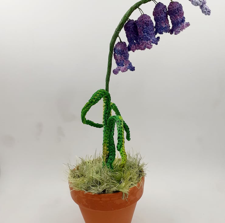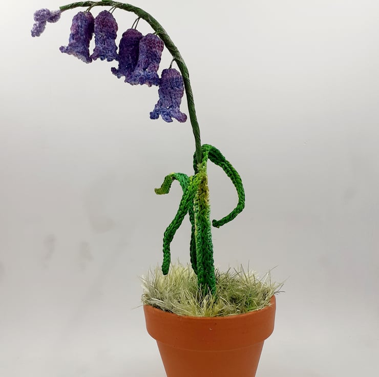The bluebell stands in a real terracotta pot which is filled with repurposed thick cotton fabric covered with a circle of 'grass' crocheted from eyelash yarn.
