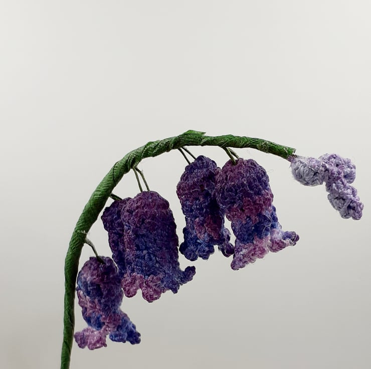This bluebell is crocheted in cotton which I have dyed with fabric paint. It is supported on a wire stem and the leaves also have floristry wire in them to help with shaping. Inside each flower head there is a tiny metal bell!
