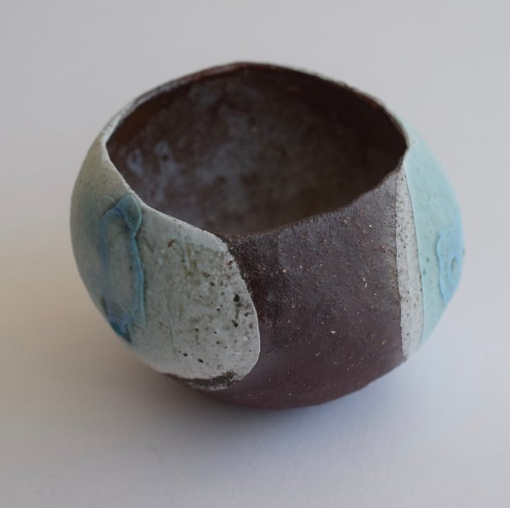 Made by pinching the clay into a fine pebble form, glazed inside with white and outside with turquoise.