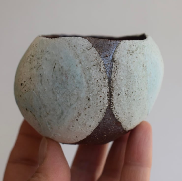 Made by pinching the clay into a fine pebble form, glazed inside with white and outside with turquoise.